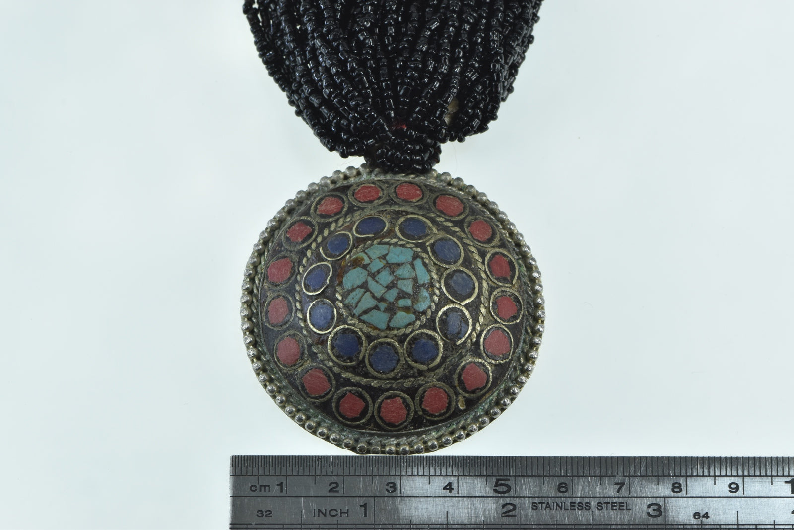 ·Item: Basemetal Tibetan Layered Beaded Inlay Medallion Necklace 15.5"