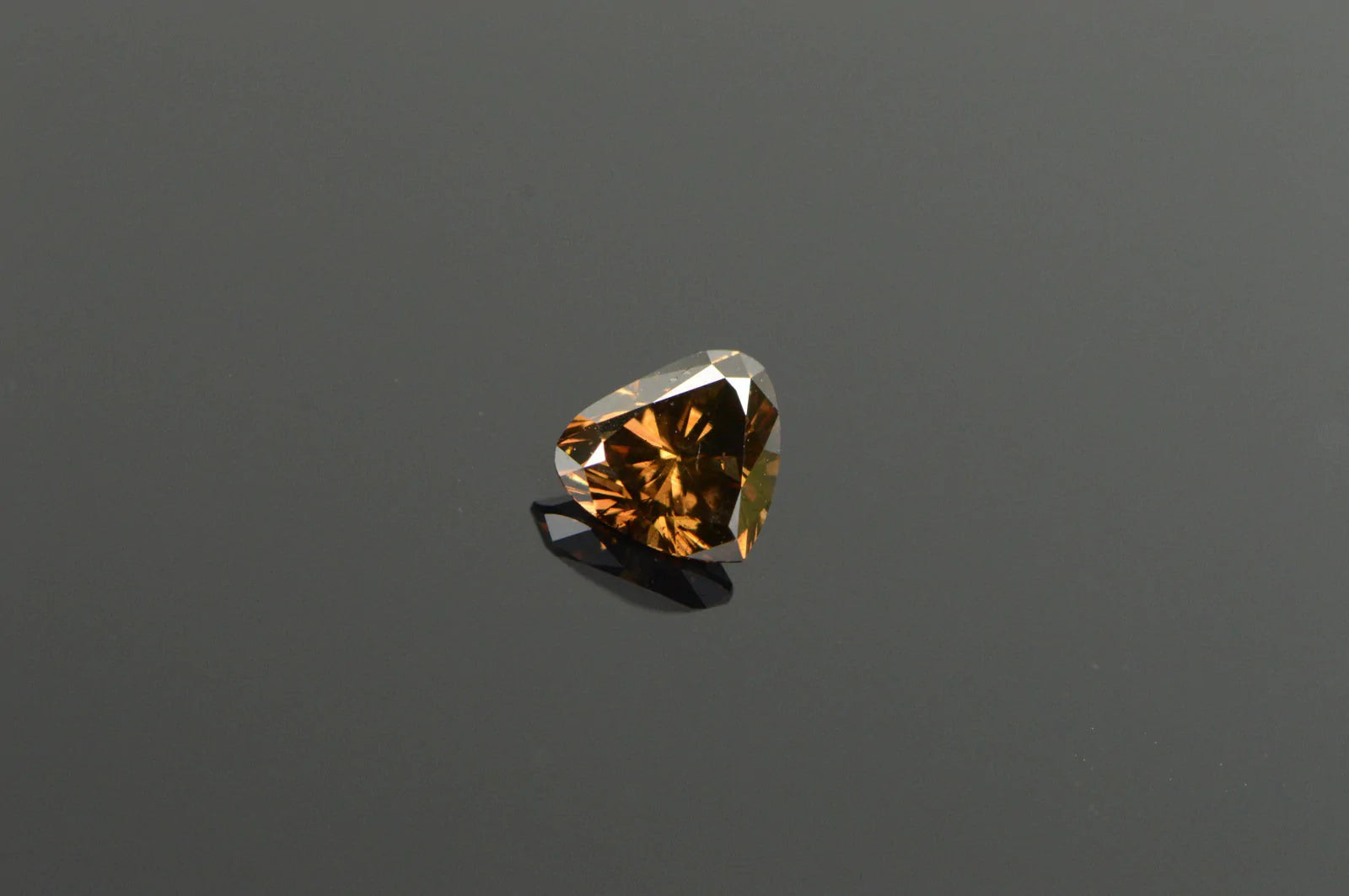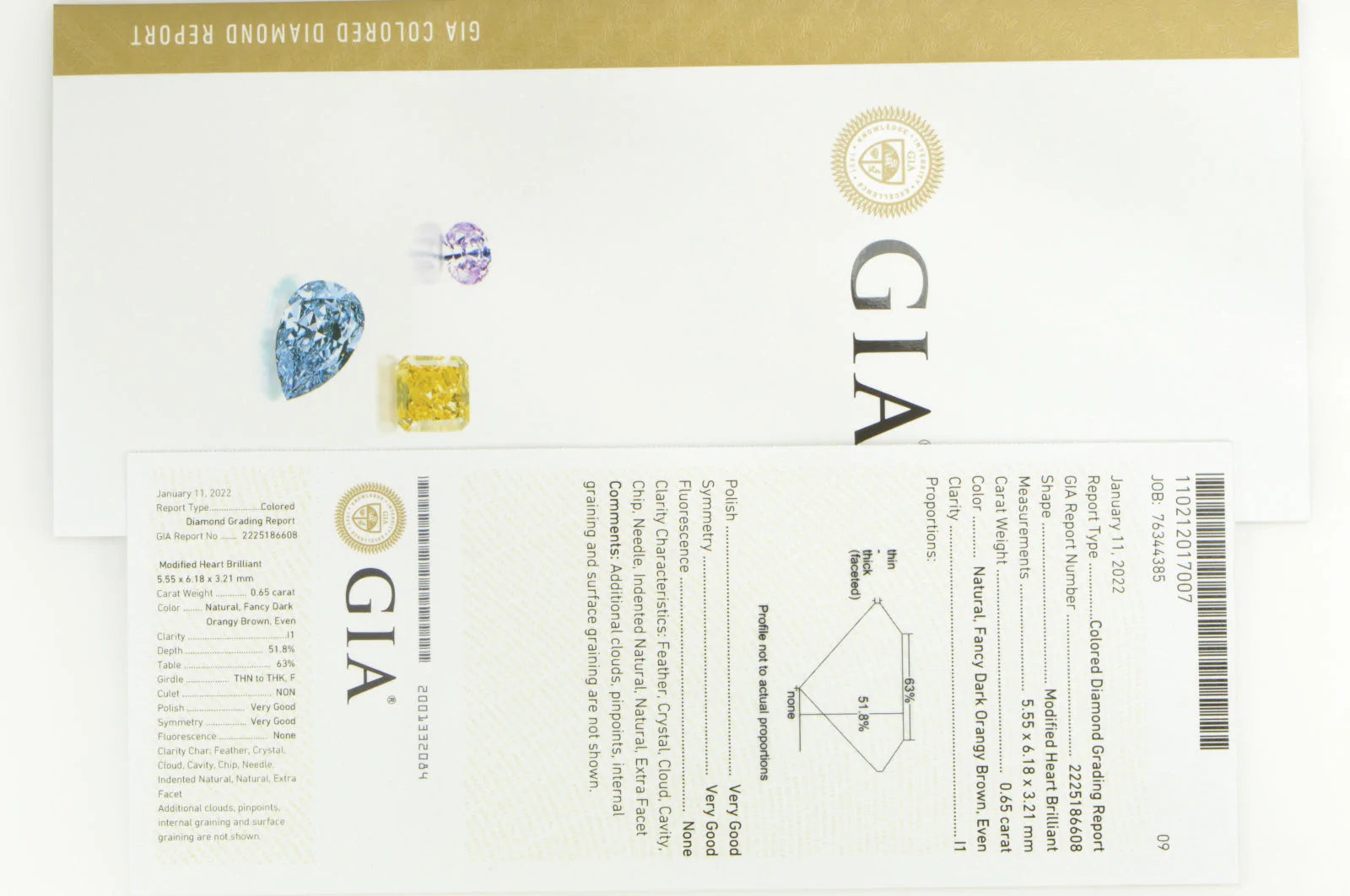 ·Notes: GIA Report No.: 2225186608 COLORED DIAMOND GRADING REPORT FOR NATURAL DIAMOND GRADING RESULTS Shape Modified Heart Brilliant Measurements 5.55 x 6.18 x 3.21 mm Carat Weight 0.65 carat Clarity Grade I1 COLOR Origin Natural Grade Fancy Dark Orangy Brown Distribution Even PROPORTIONS Depth 51.8% Table 63% Girdle Thin to Thick, Faceted Culet None FINISH Polish Very Good Symmetry Very Good FLUORESCENCE Fluorescence None CLARITY CHARACTERISTICS Clarity Characteristics Feather, Crystal, Cloud, Cavity, Chip, Needle, Indented Natural, Natural, Extra Facet