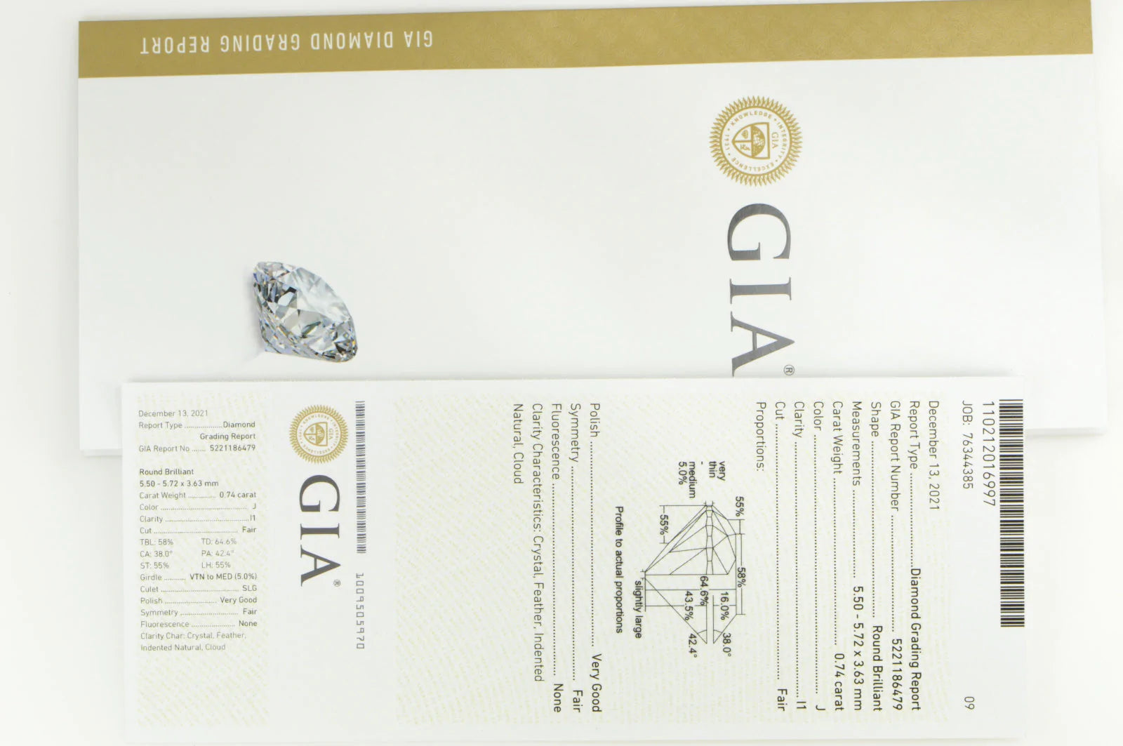 ·Notes: GIA Report No.:5221186479 DIAMOND GRADING REPORT FOR NATURAL DIAMOND GRADING RESULTS Shape Round Brilliant Measurements 5.50 - 5.72 x 3.63 mm Carat Weight 0.74 carat Color Grade J Clarity Grade I1 Cut Grade Fair PROPORTIONS Depth 64.6% Table 58% Crown Angle 38.0° Crown Height 16.0% Pavilion Angle 42.4° Pavilion Depth 43.5% Star Length 55% Lower Half 55% Girdle Very Thin to Medium, 5.0% Culet Slightly Large FINISH Polish Very Good Symmetry Fair FLUORESCENCE Fluorescence None CLARITY CHARACTERISTICS Clarity Characteristics Crystal, Feather, Indented Natural, Cloud