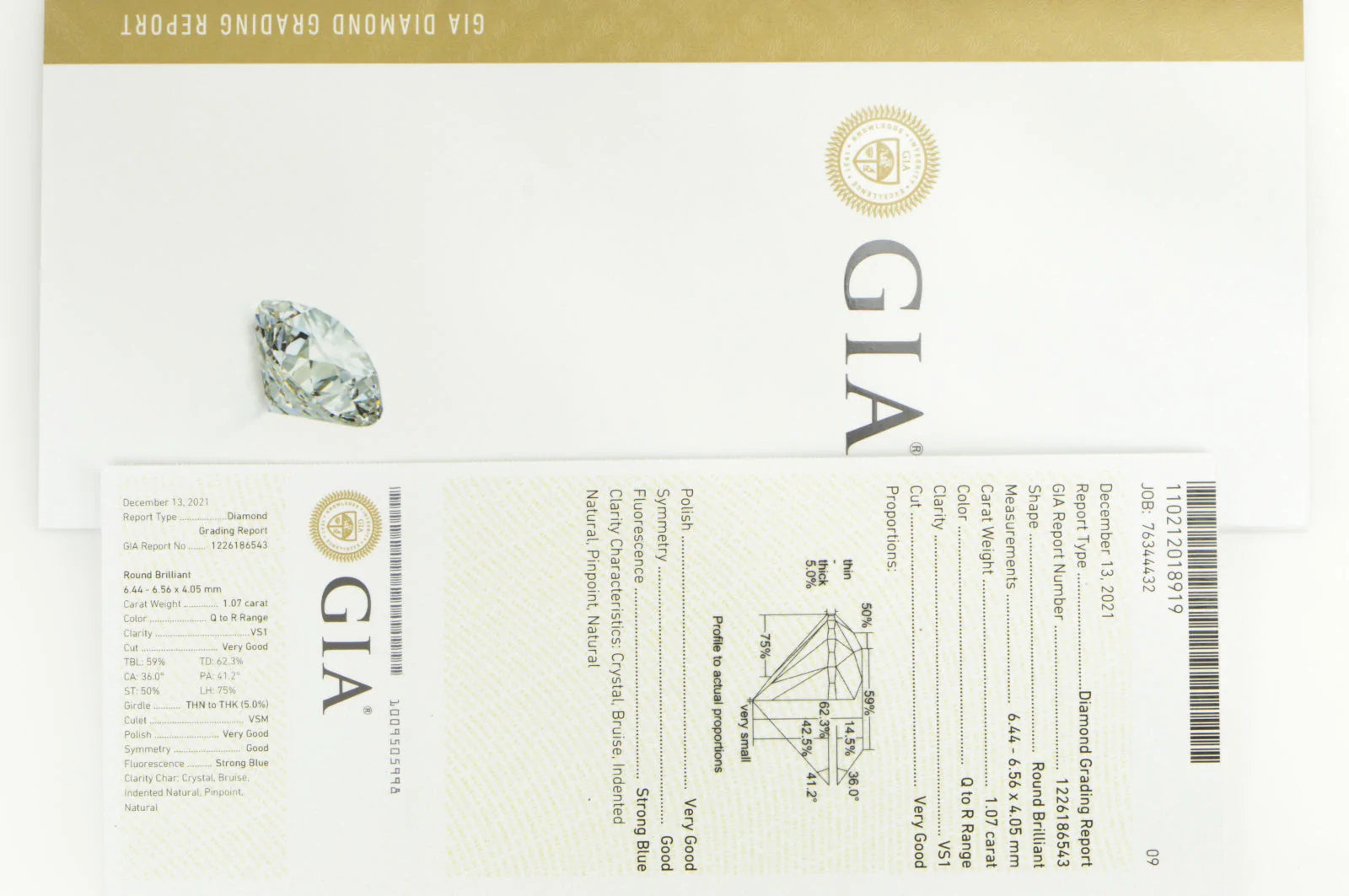 ·Item: GIA 1.07 Ct Round Brilliant Cut Q-R Color, VS1 Clarity Diamond
