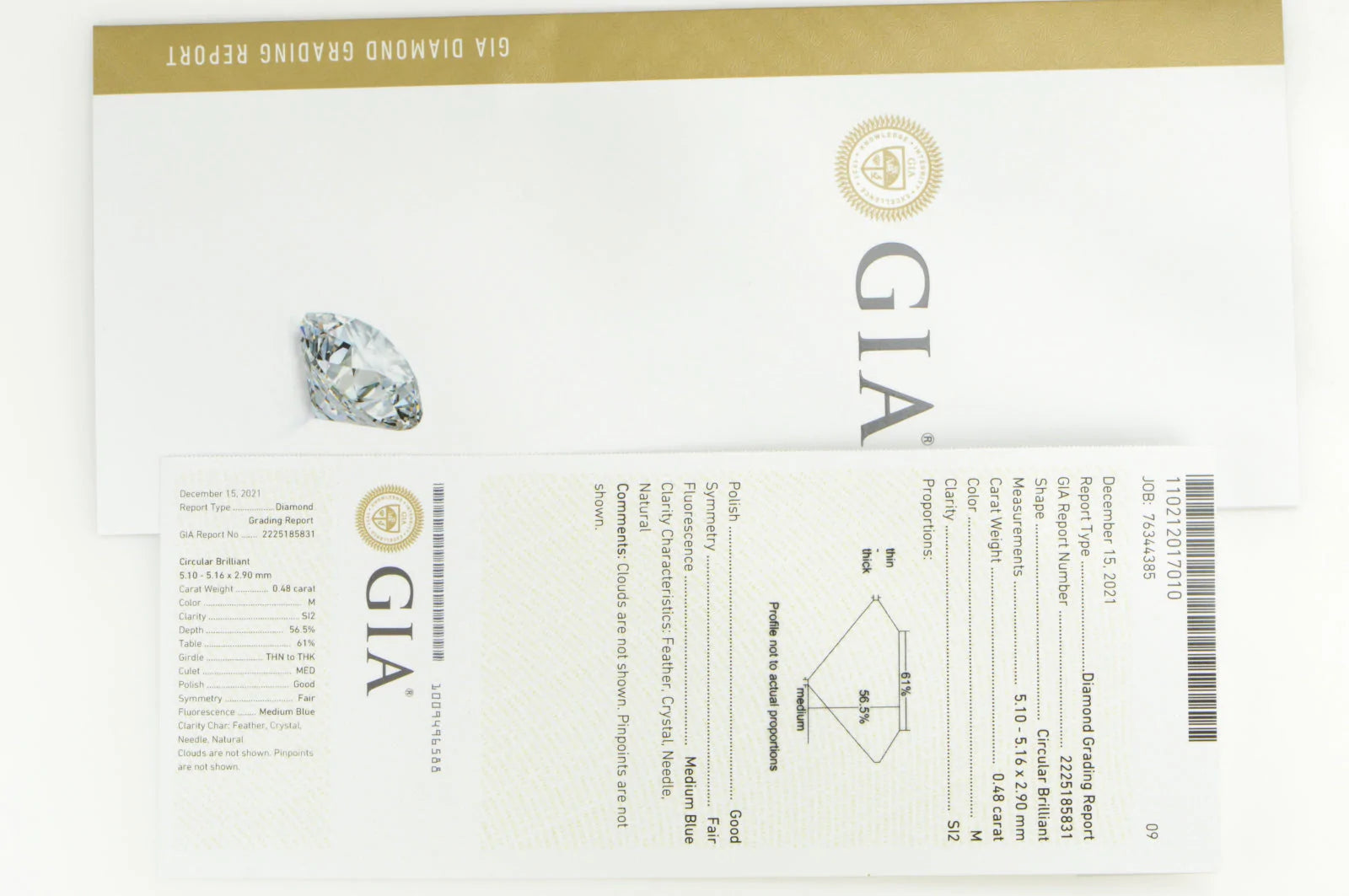 ·Notes: GIA Report No.:2225185831 DIAMOND GRADING REPORT FOR NATURAL DIAMOND GRADING RESULTS Shape Circular Brilliant Measurements 5.10 - 5.16 x 2.90 mm Carat Weight 0.48 carat Color Grade M Clarity Grade SI2 PROPORTIONS Depth 56.5% Table 61% Girdle Thin to Thick Culet Medium FINISH Polish Good Symmetry Fair FLUORESCENCE Fluorescence Medium Blue CLARITY CHARACTERISTICS Clarity Characteristics Feather, Crystal, Needle, Natural