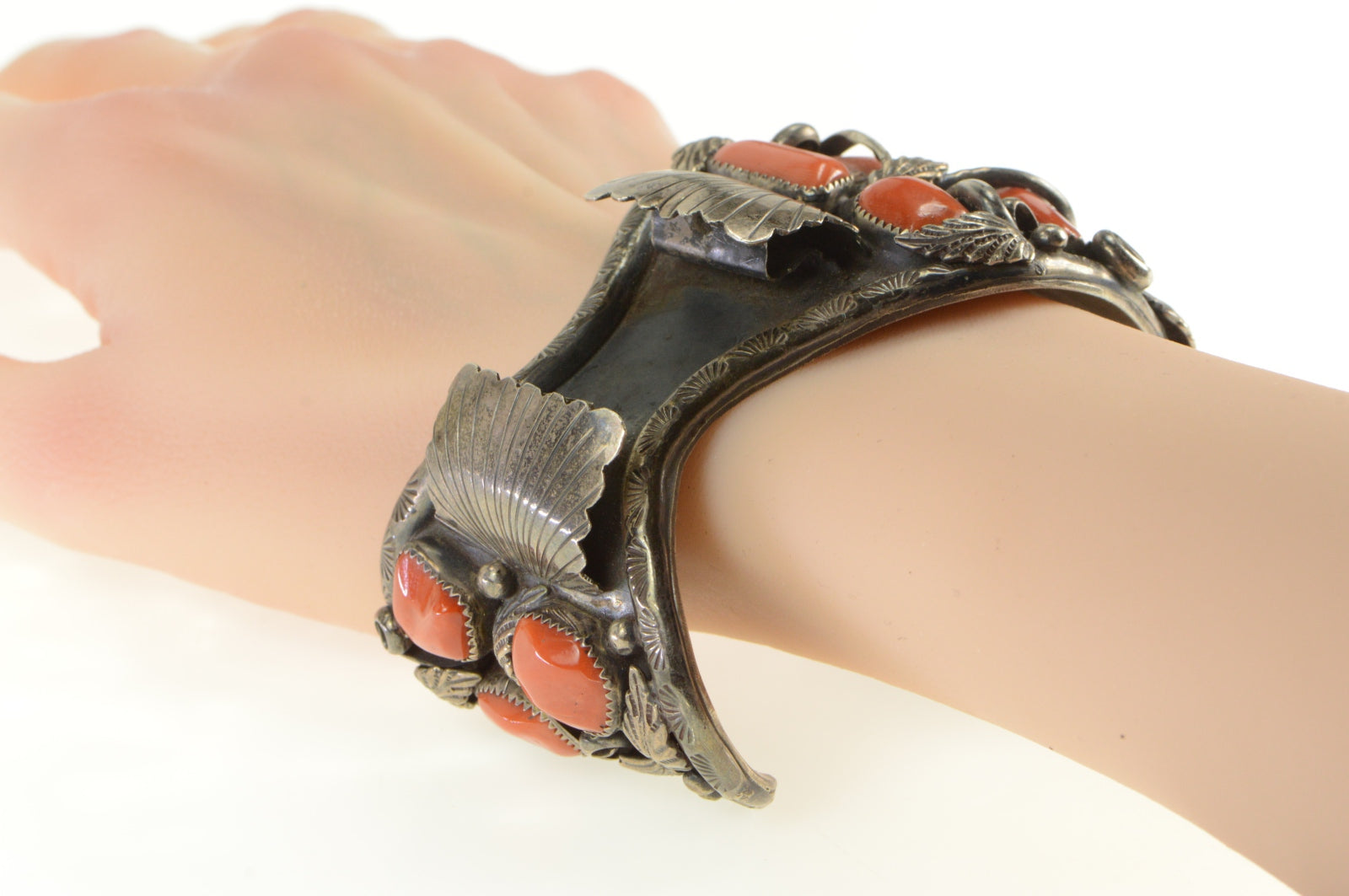·Item: Sterling Silver Navajo Coral Jerry Wilma Begay Watch Cuff Bracelet 8.5"