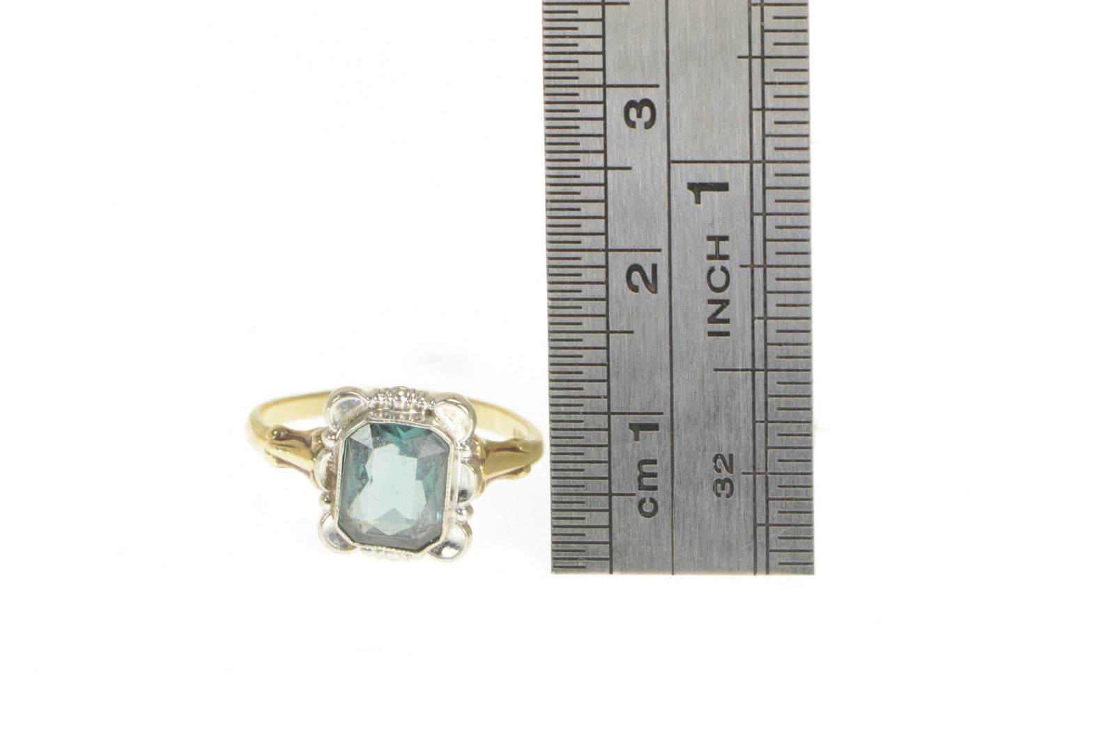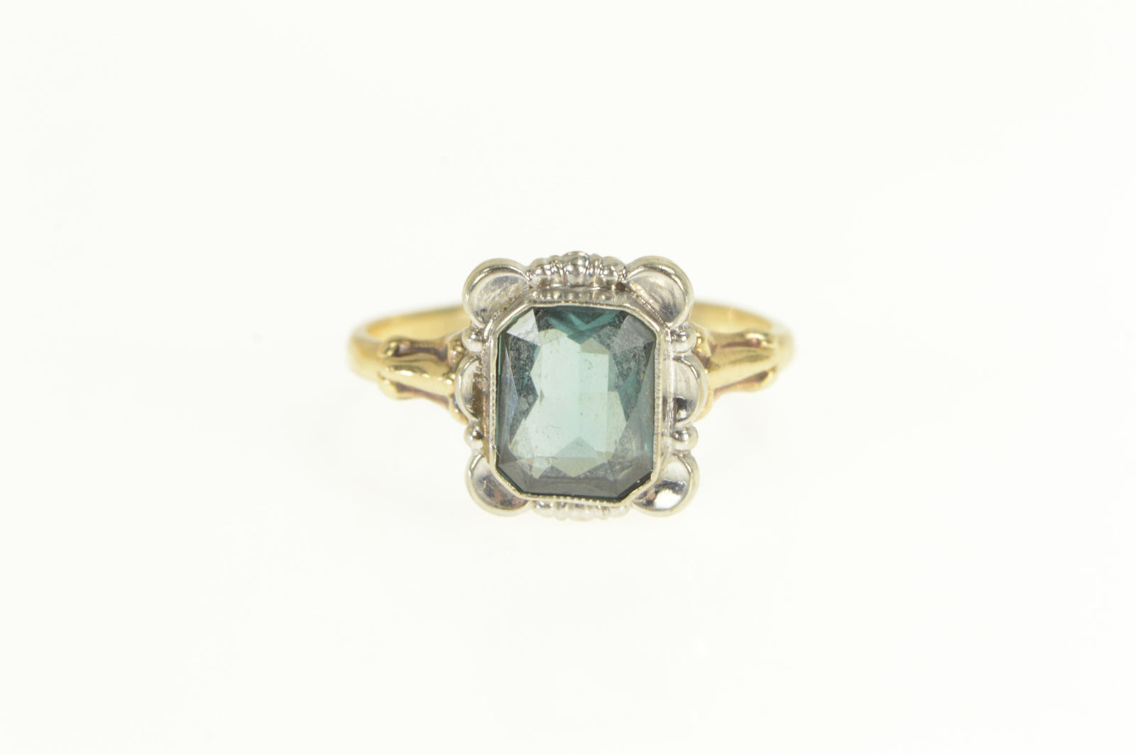 ·Item: 10K 1940's Syn. Blue Topaz Two Tone Statement Ring Size 5.75 Yellow Gold