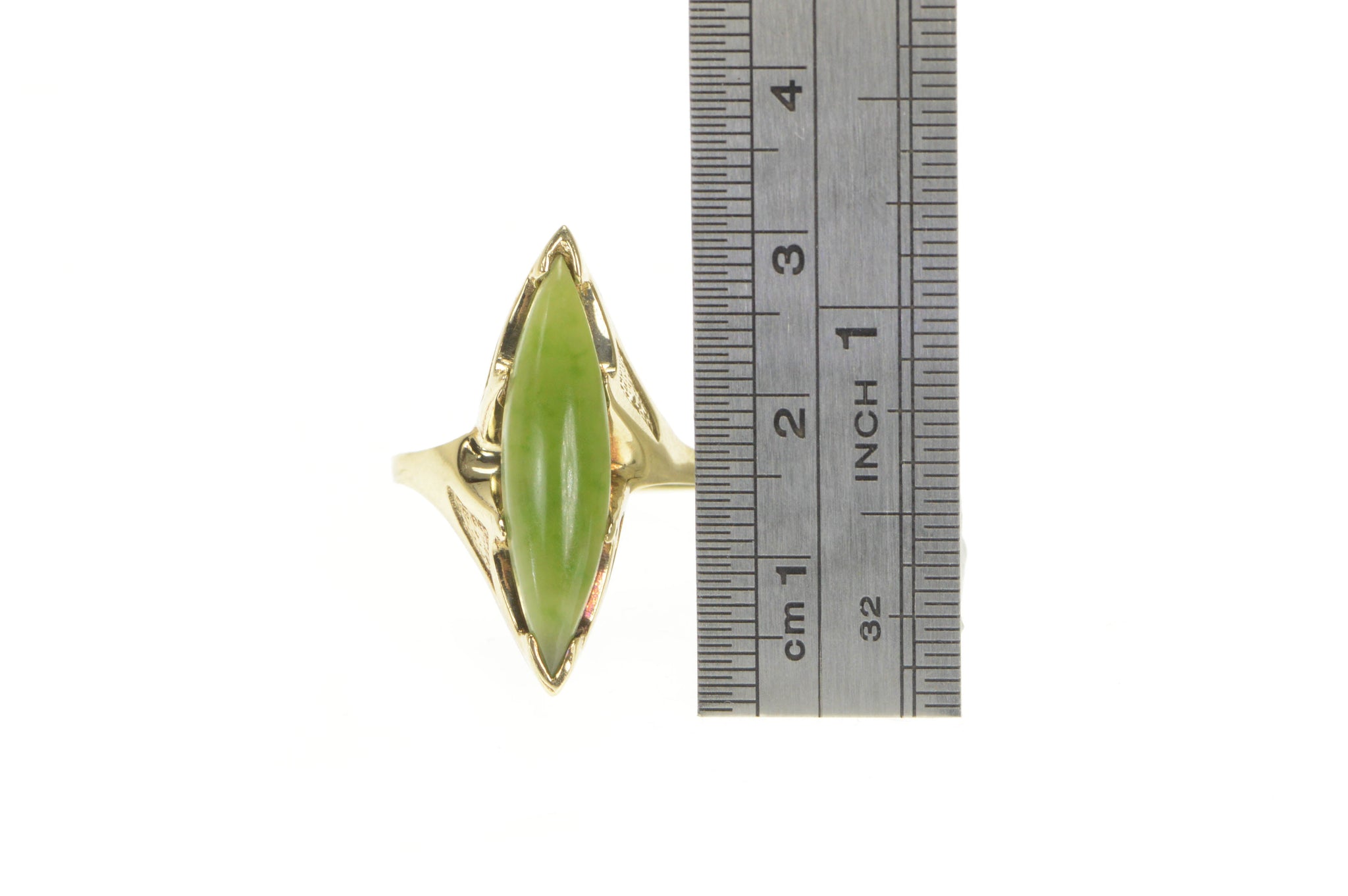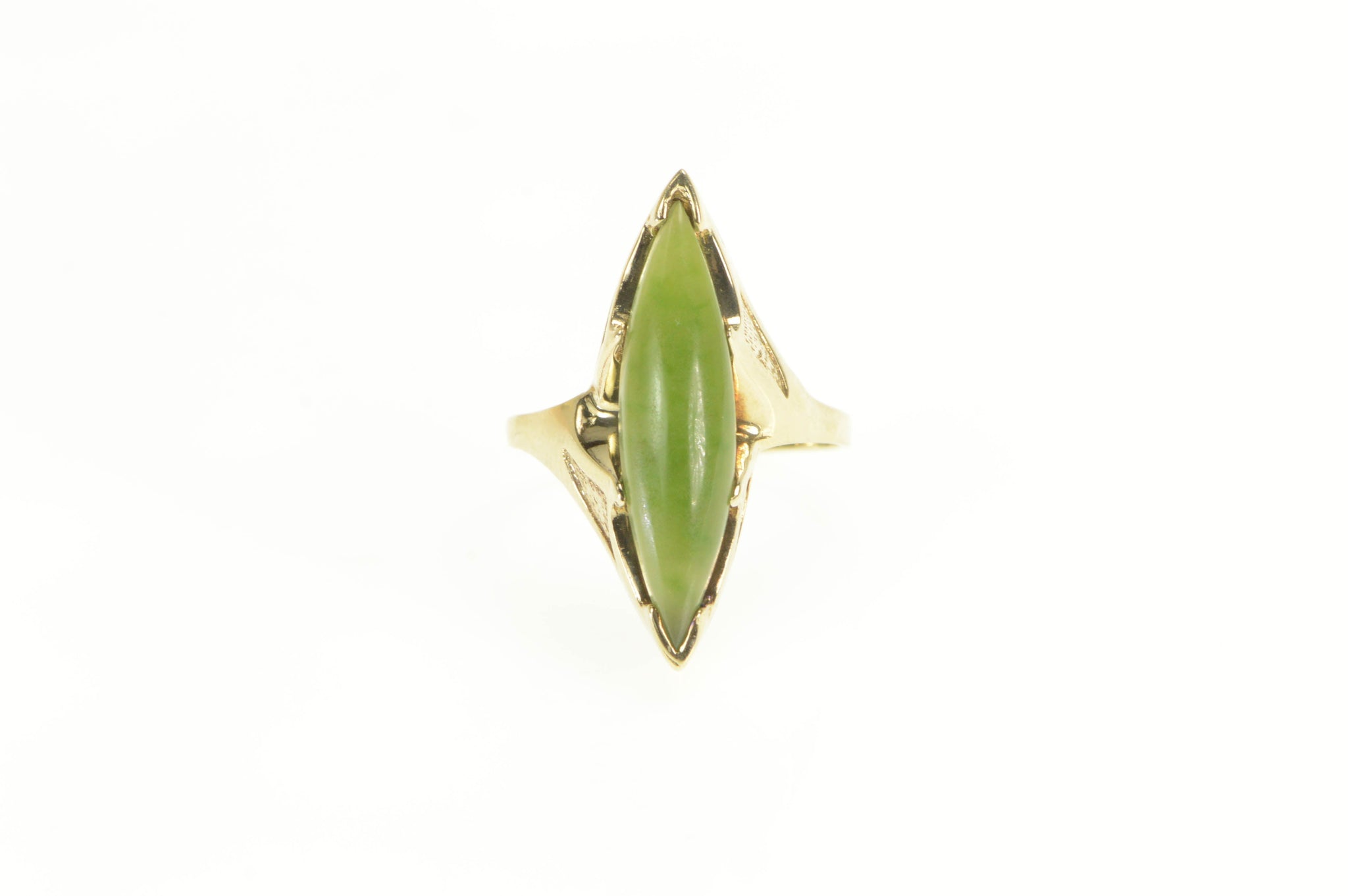 ·Item: 10K 1960's Marquise Nephrite Cabochon Navette Ring Size 9.5 Yellow Gold