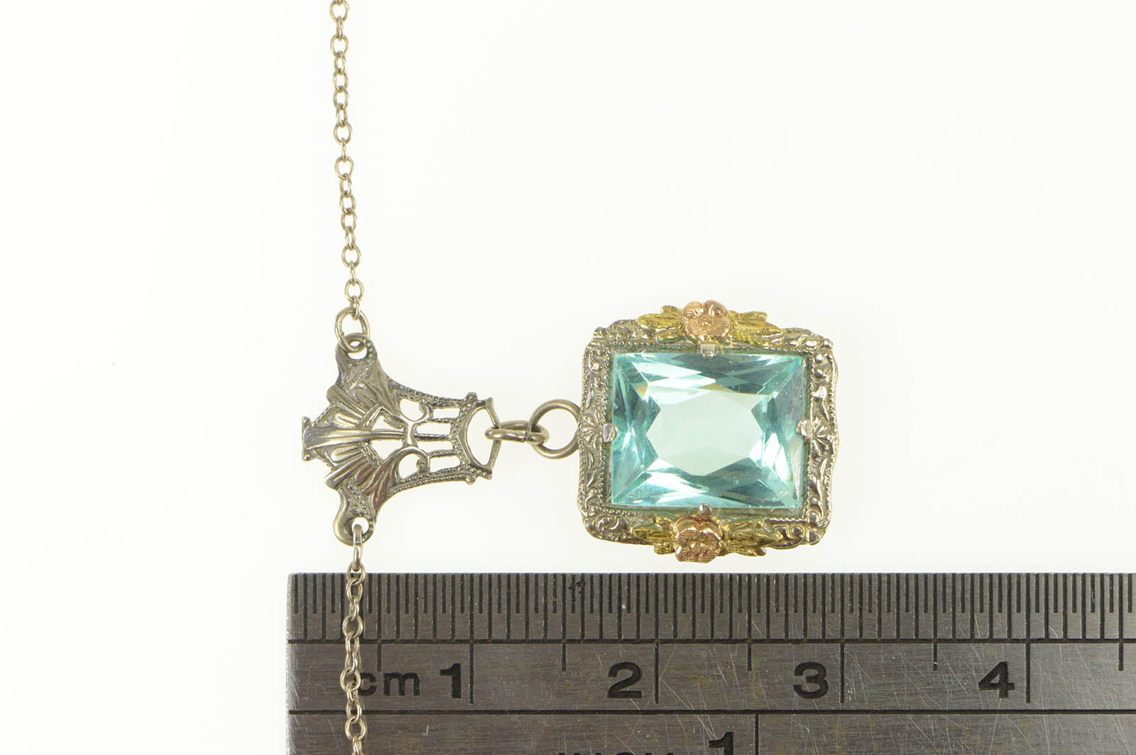 ·Item: 10K Art Deco Floral Filigree Sim. Blue Topaz Necklace 16.5" White Gold