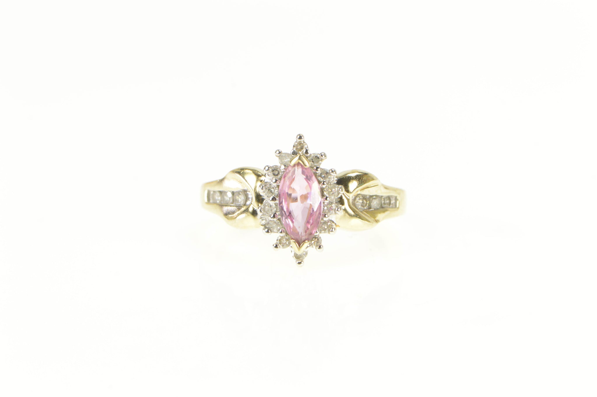 ·Item: 10K Marquise Pink Sapphire Diamond Halo Ring Size 5.25 Yellow Gold