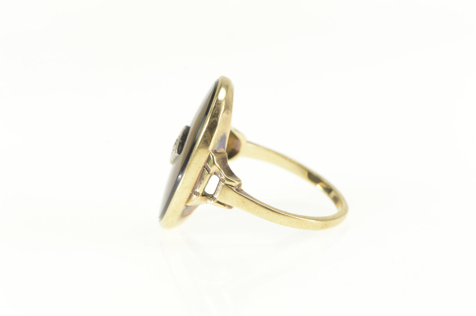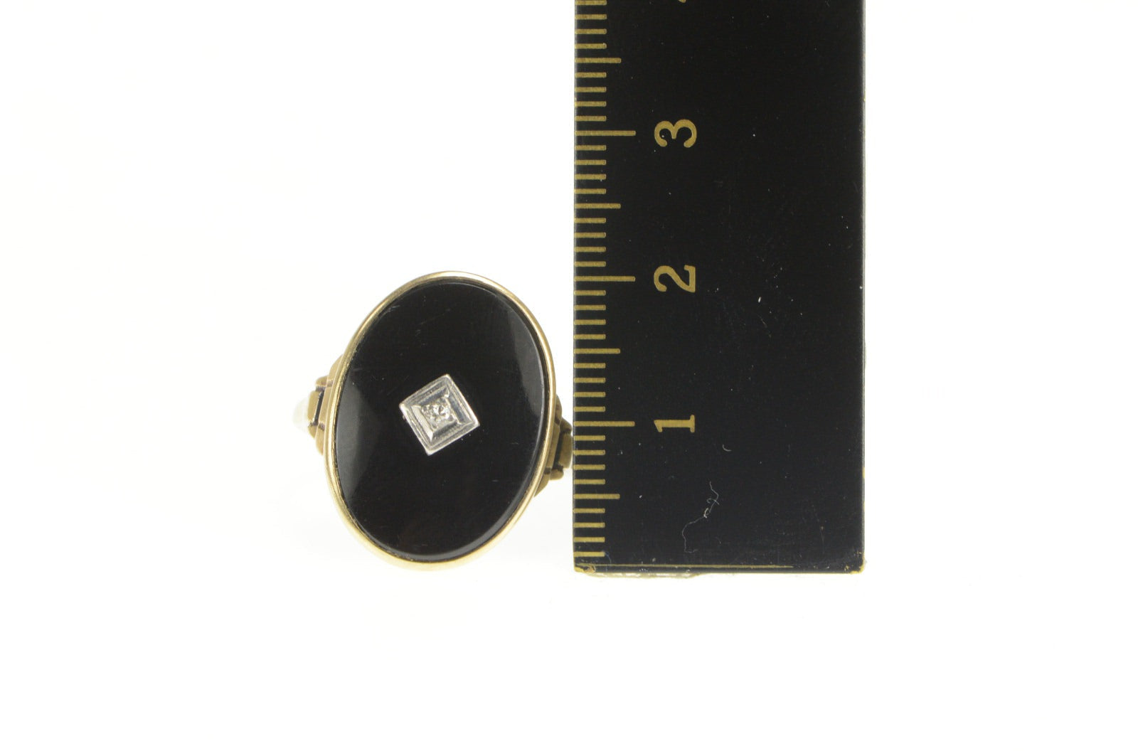 ·Item: 10K Retro Ornate Black Onyx Diamond Overlay Ring Size 7.5 Yellow Gold