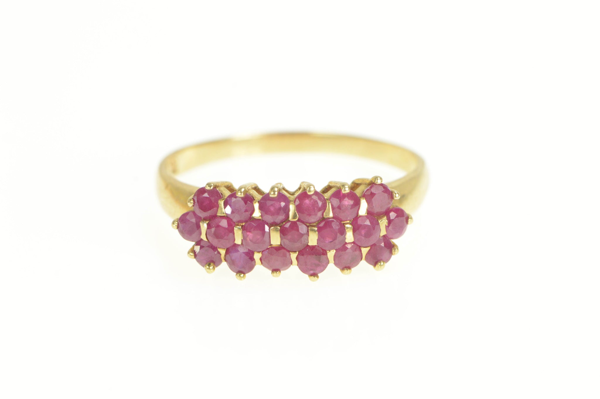 ·Item: 10K Tiered Ruby Cluster Statement Band Ring Size 10 Yellow Gold
