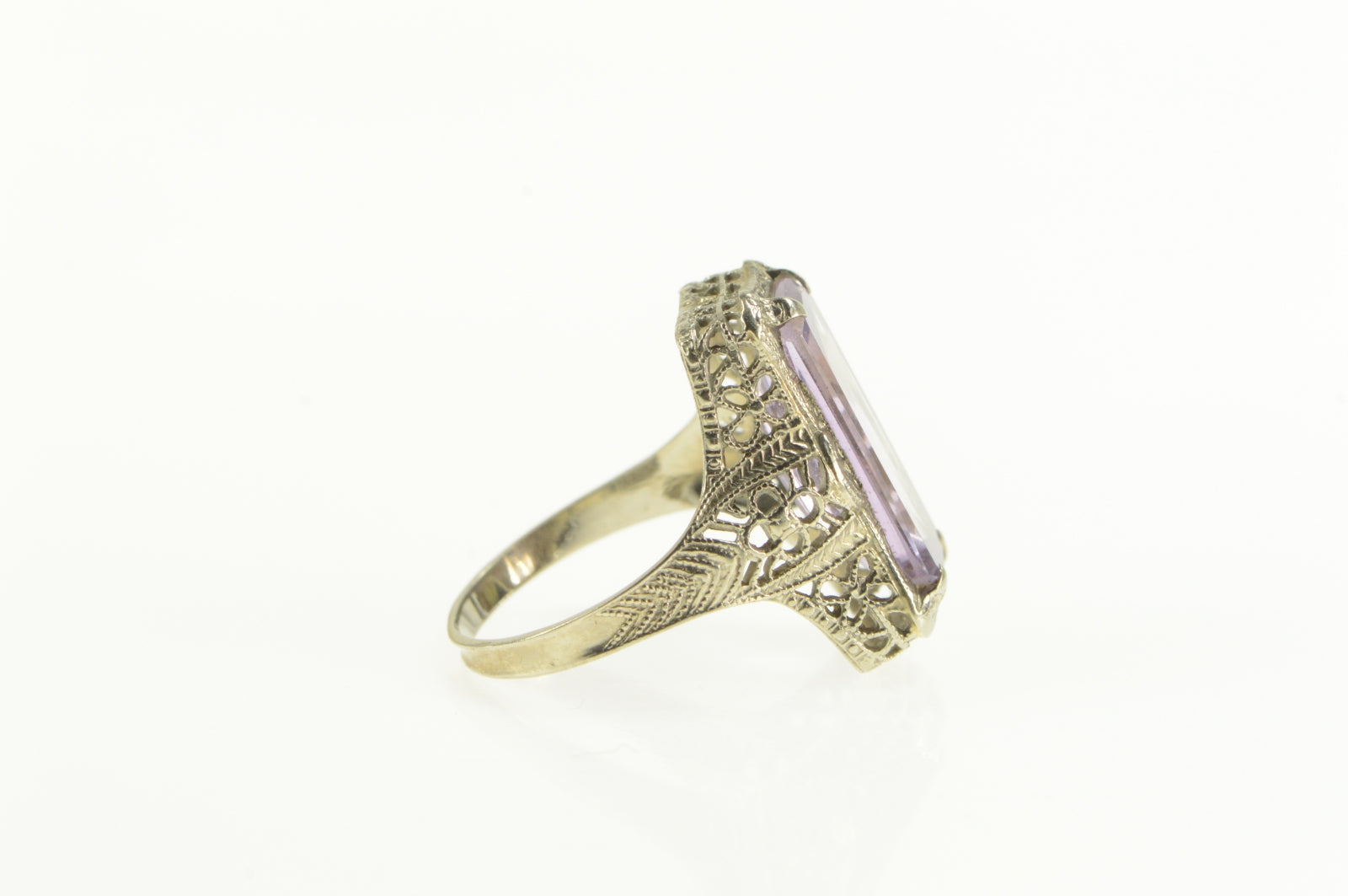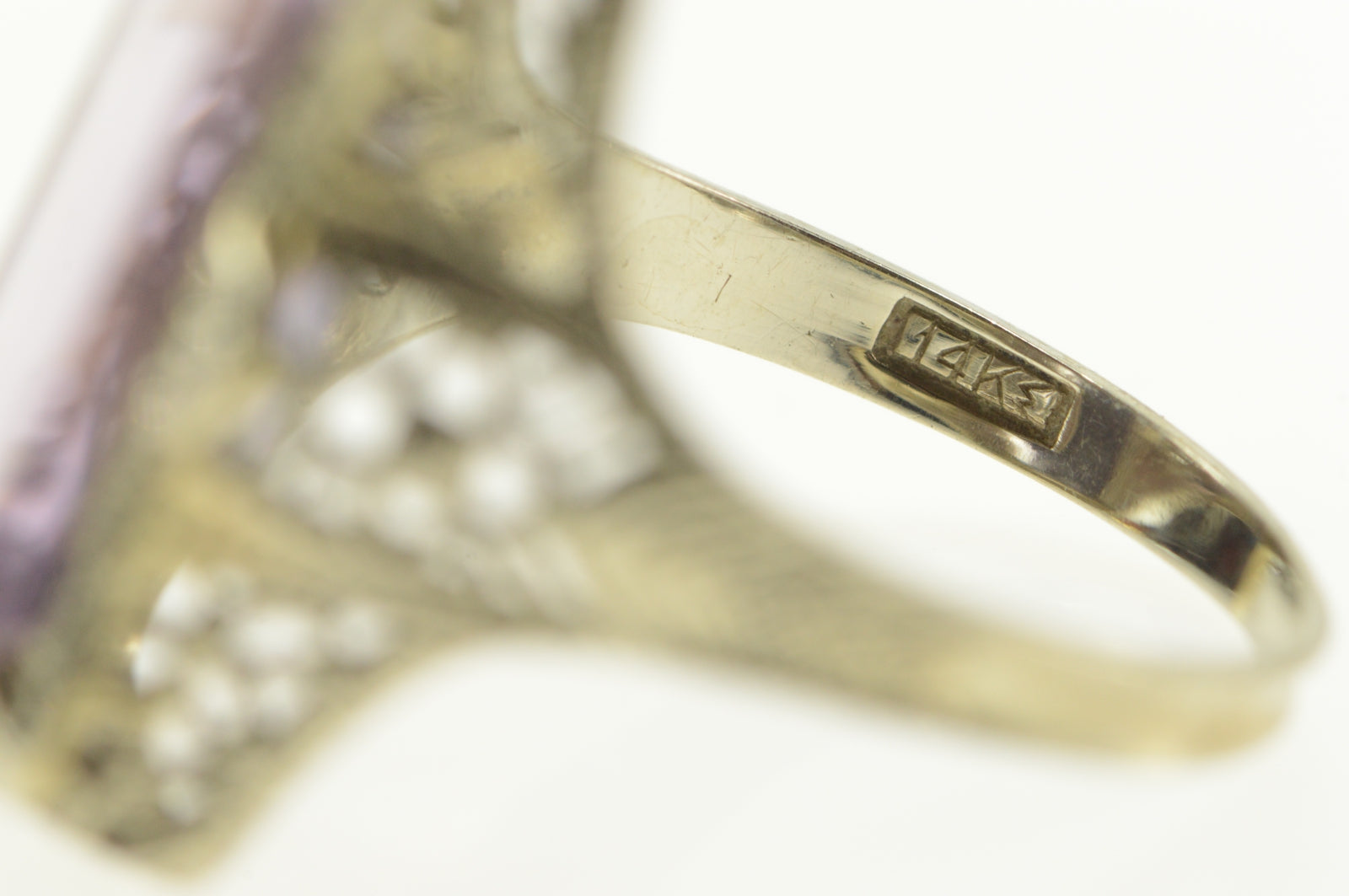 ·Item: 14K Art Deco Amethyst Ornate Filigree Statement Ring Size 4.75 White Gold