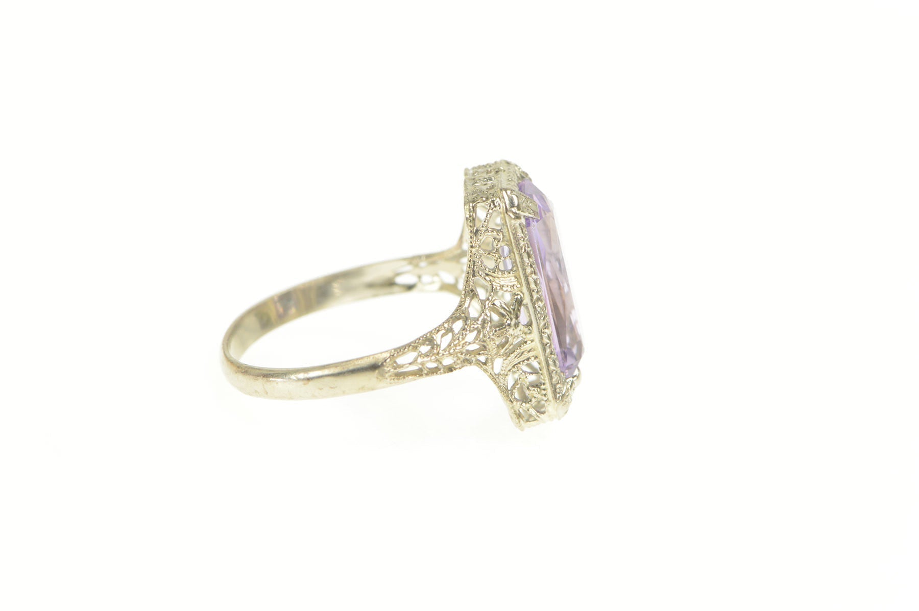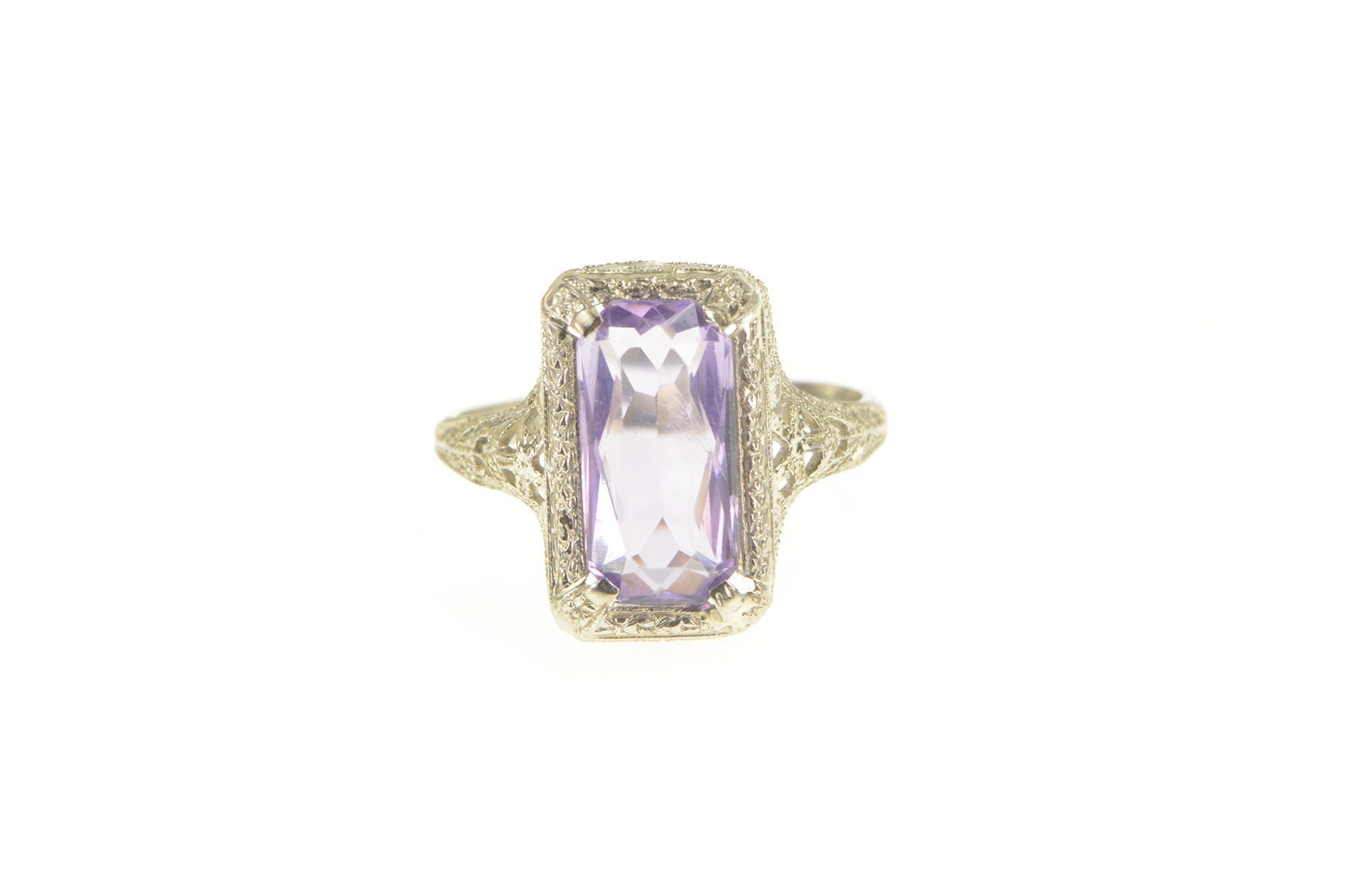 ·Item: 14K Art Deco Emerald Cut Amethyst Filigree Ring Size 5 White Gold