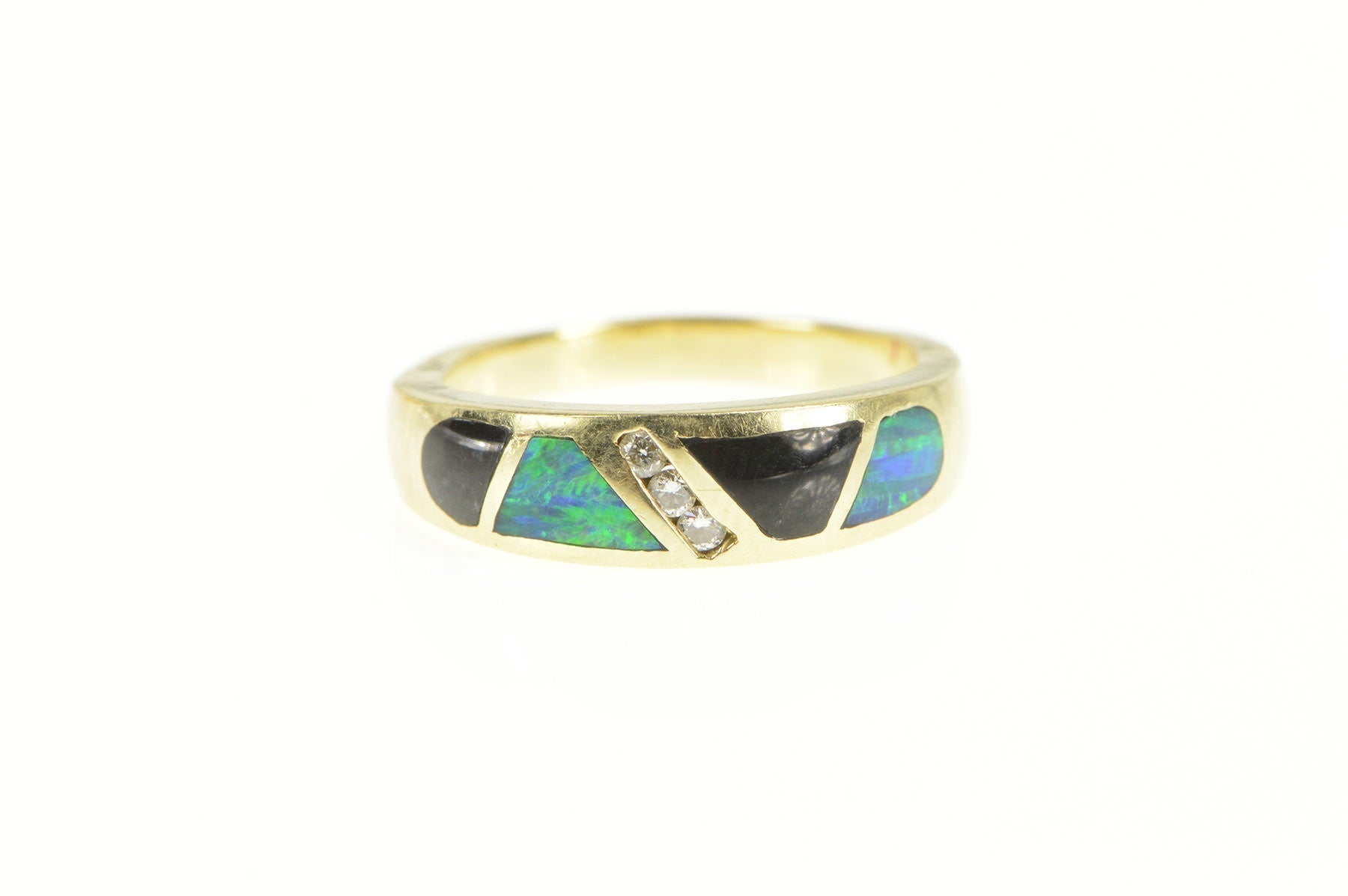 ·Item: 14K Diamond Black Opal & Onyx Inlay Band Ring Size 8.5 Yellow Gold