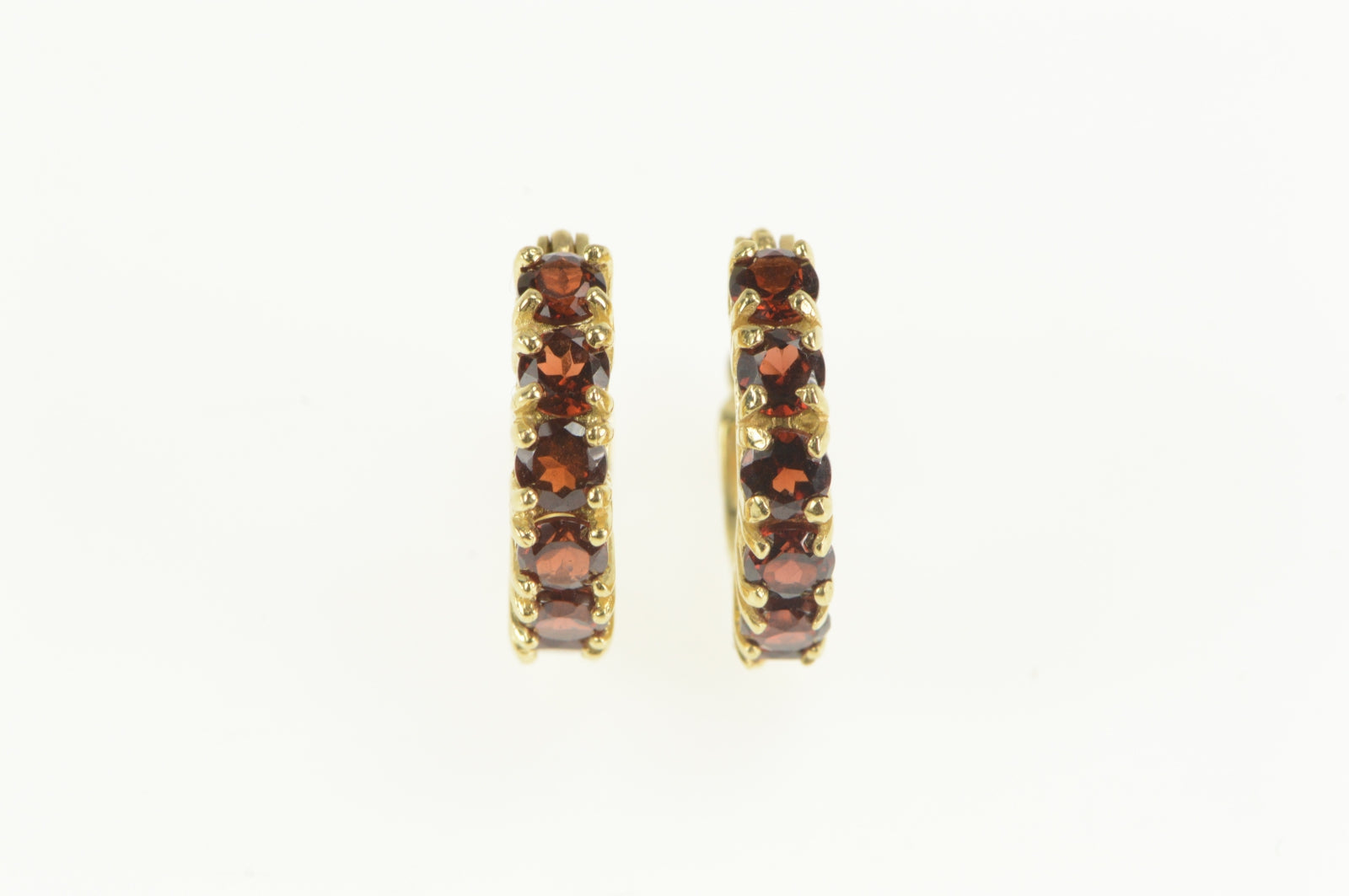 ·Item: 14K Garnet Inset Ornate Filigree Fashion Hoop Earrings Yellow Gold