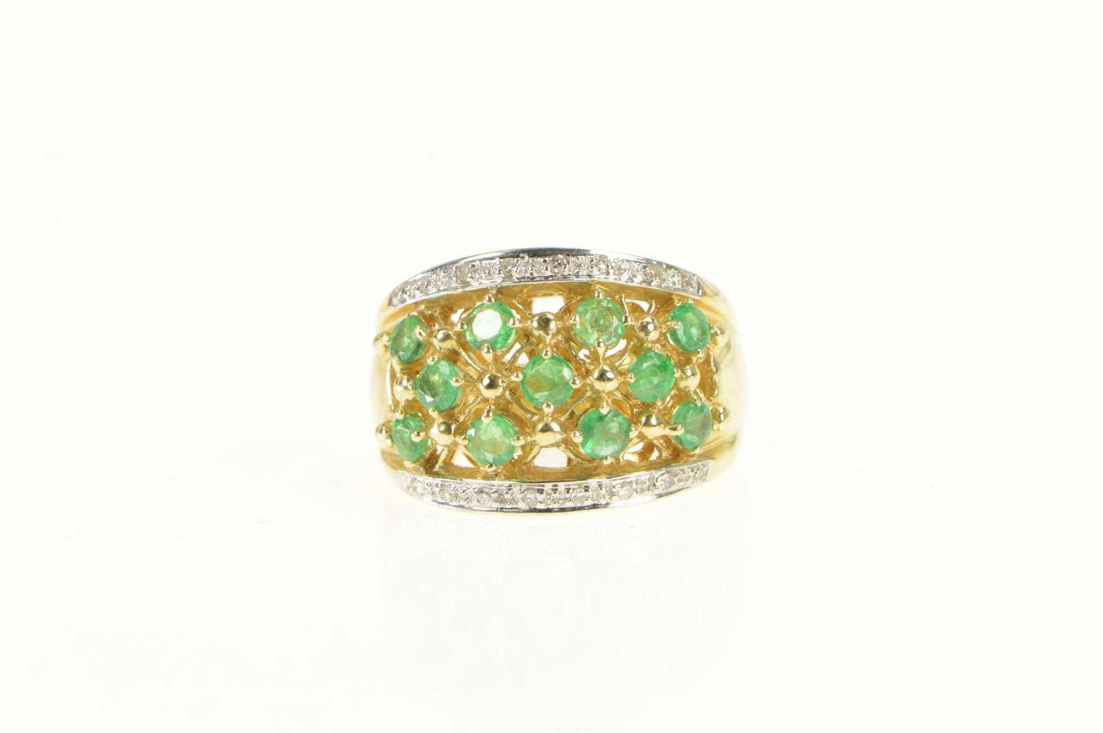 14K Natural Emerald Diamond Lattice Domed Band Ring Yellow Gold