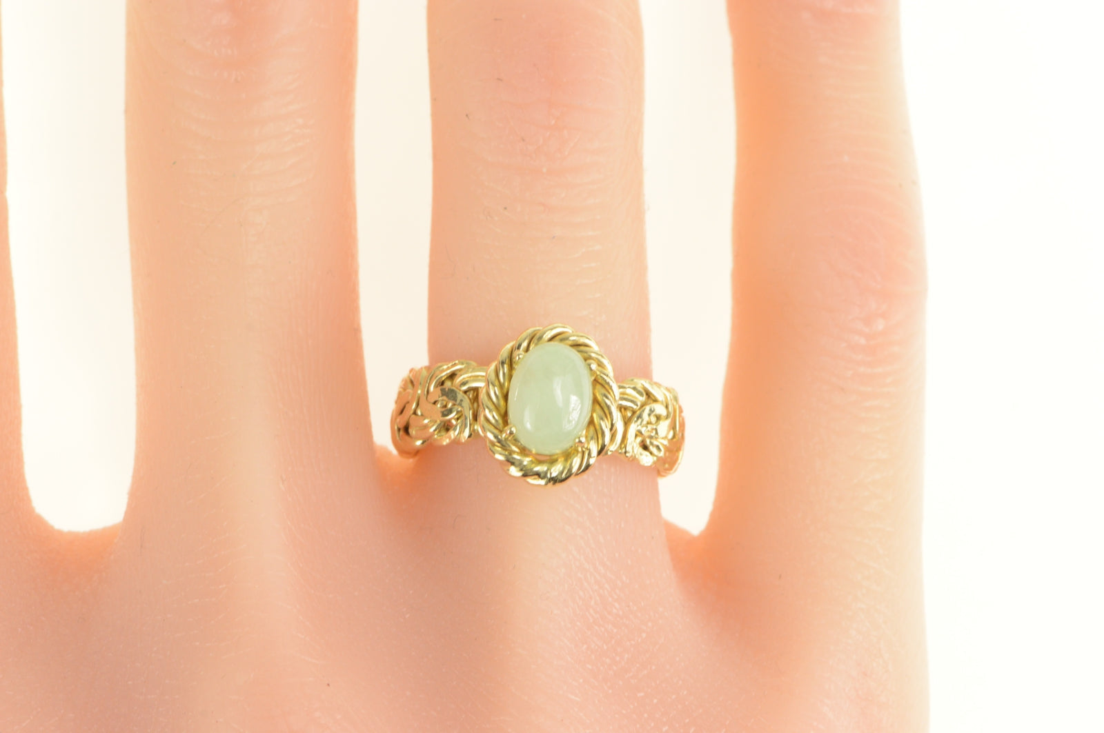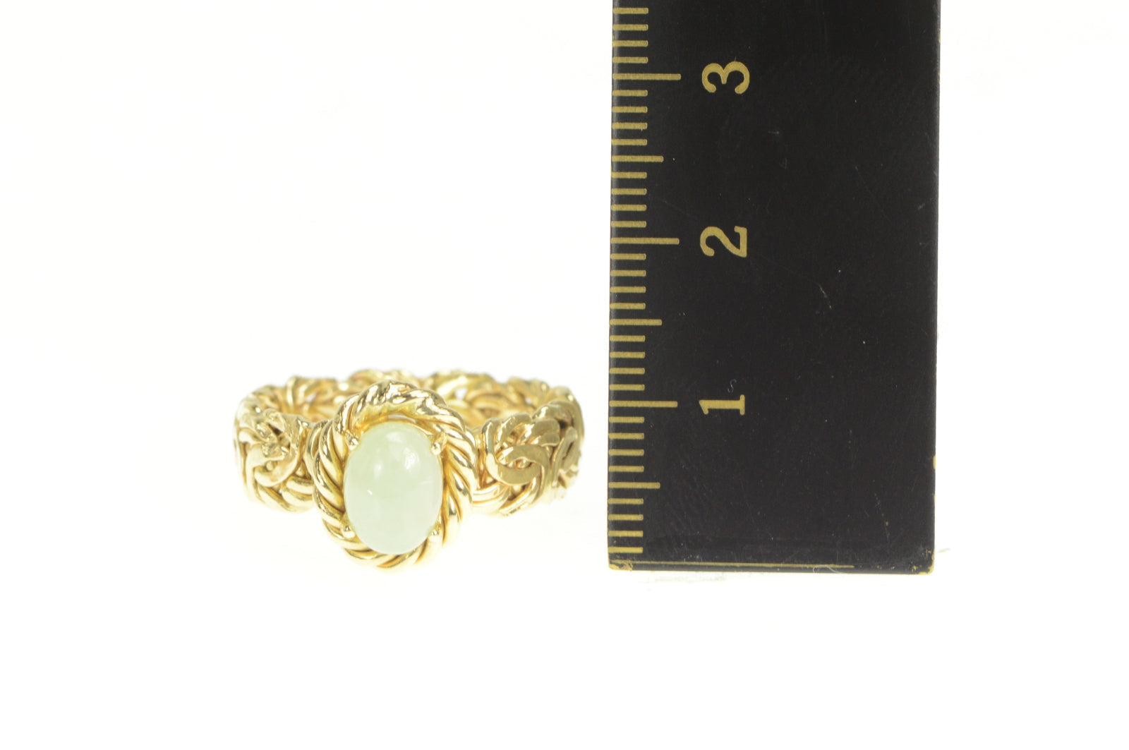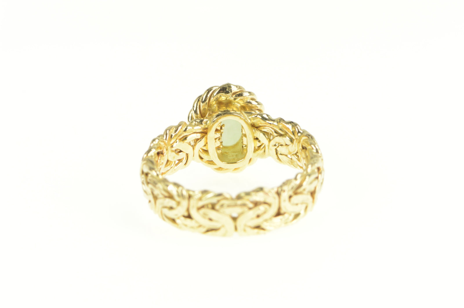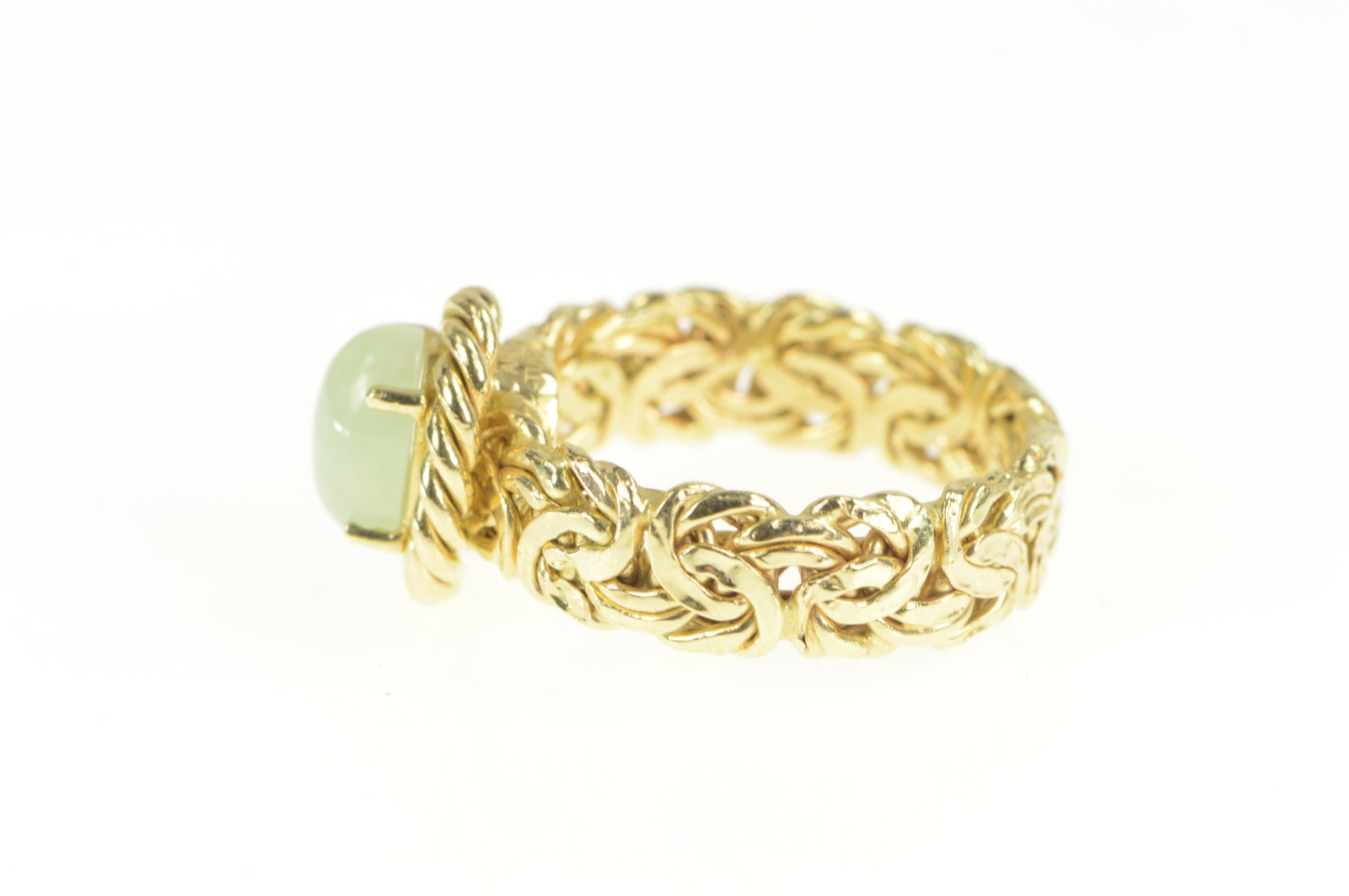 ·Item: 14K Oval Jade Byzantine Chain Band Statement Ring Size 6.75 Yellow Gold
