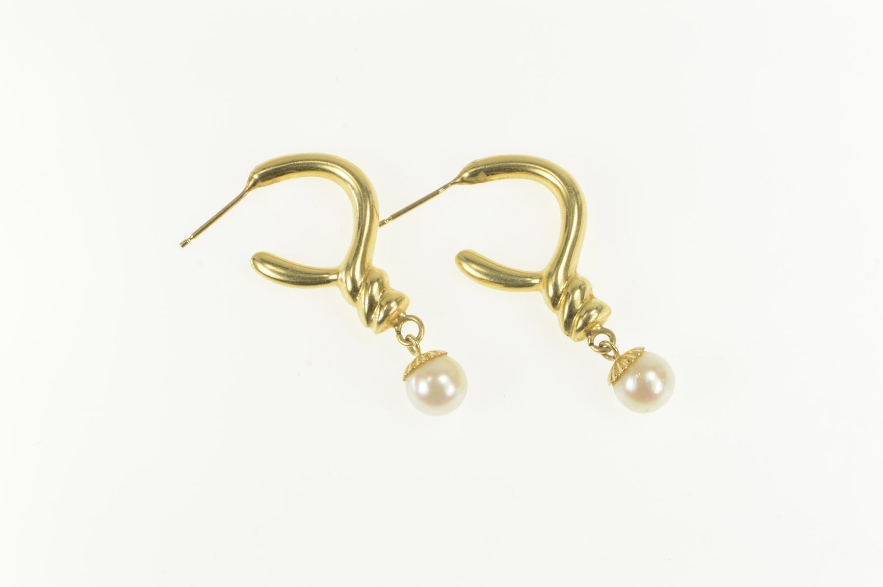 ·Item: 14K Pearl Dangle Twist Puffy Statement Hoop Earrings Yellow Gold