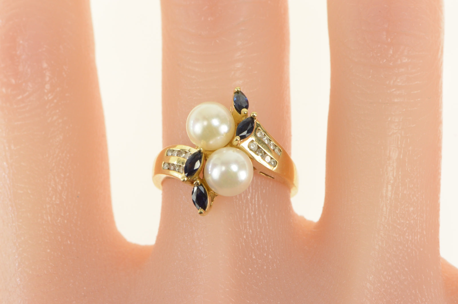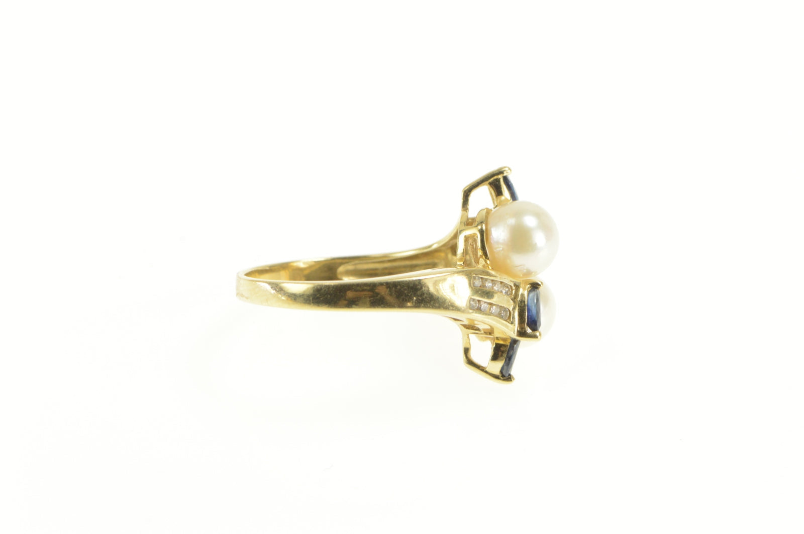 ·Item: 14K Pearl Sapphire Diamond Bypass Statement Ring Size 7.75 Yellow Gold