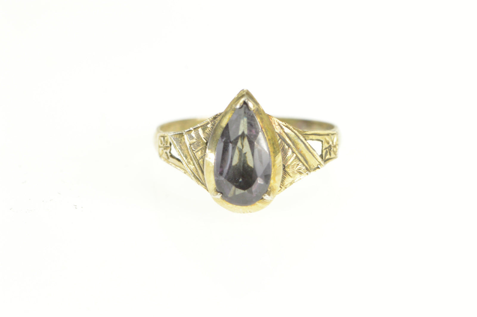 ·Item: Gold Filled Pear Amethyst Art Deco Leaf Engraved Ring Size 7.25