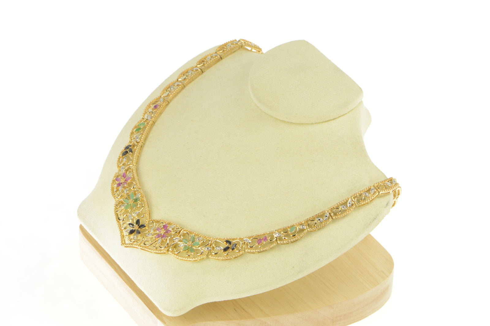 ·Item: Sterling Silver Emerald Ruby Sapphire Diamond Filigree Necklace 19.25"