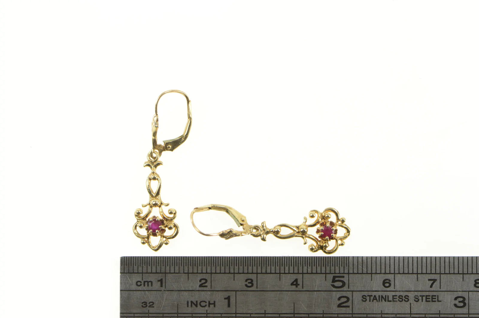 ·Item: 10K Natural Ruby Ornate Scroll Filigree Dangle Earrings Yellow Gold