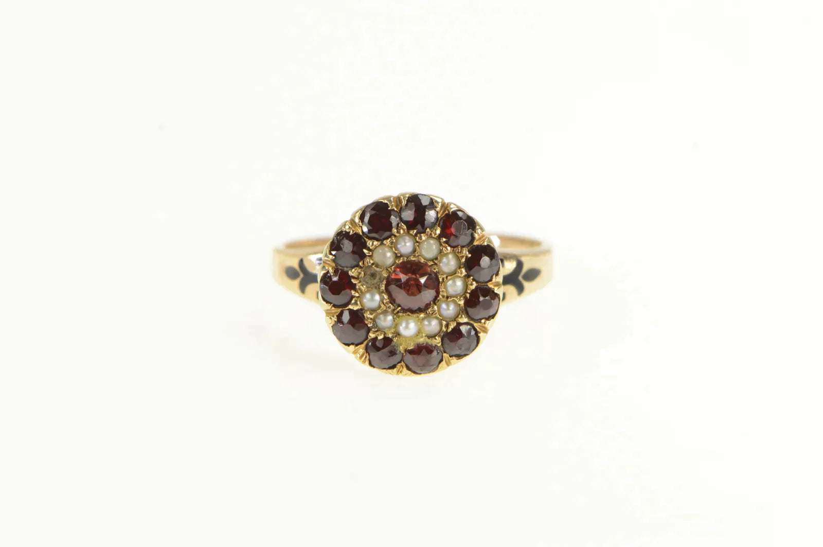 ·Item: 10K Victorian Garnet Seed Pearl Ornate Halo Cocktail Ring Size 7.25 Yellow Gold