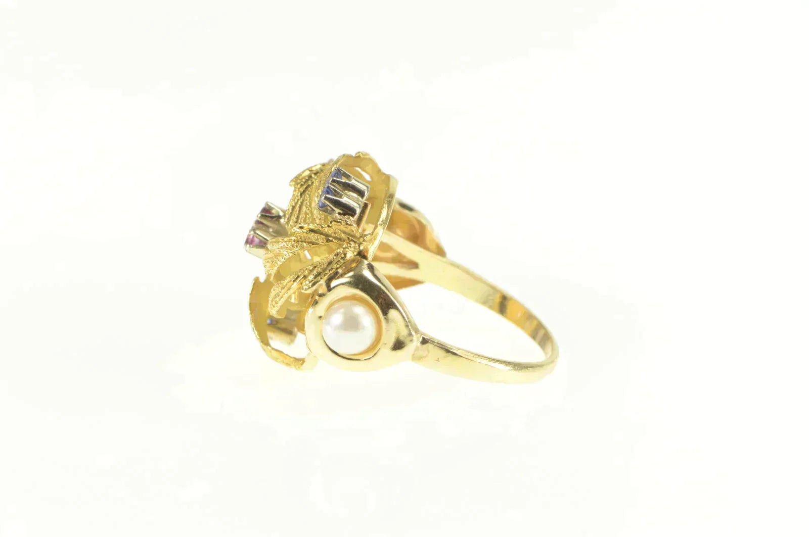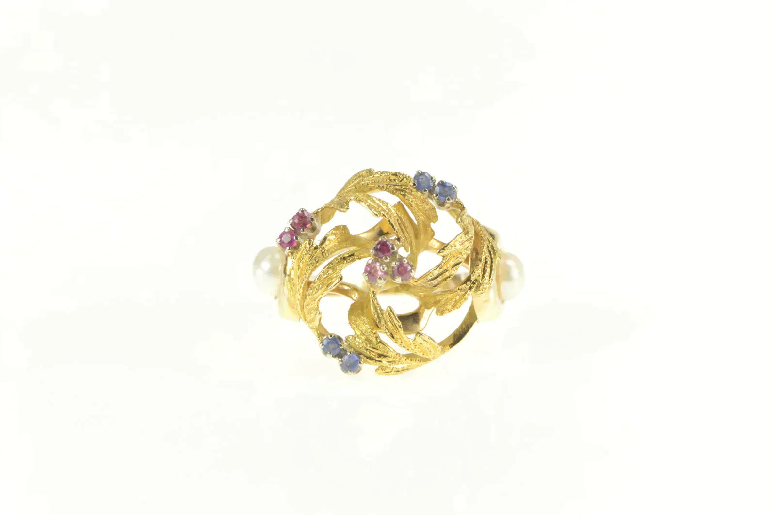 ·Item: 14K 1960's Ruby Sapphire Pearl Cluster Cocktail Ring Size 7 Yellow Gold