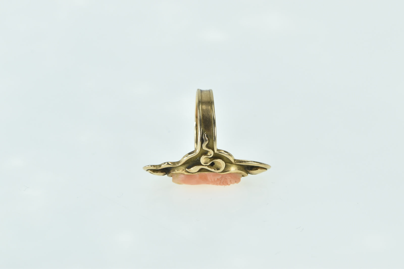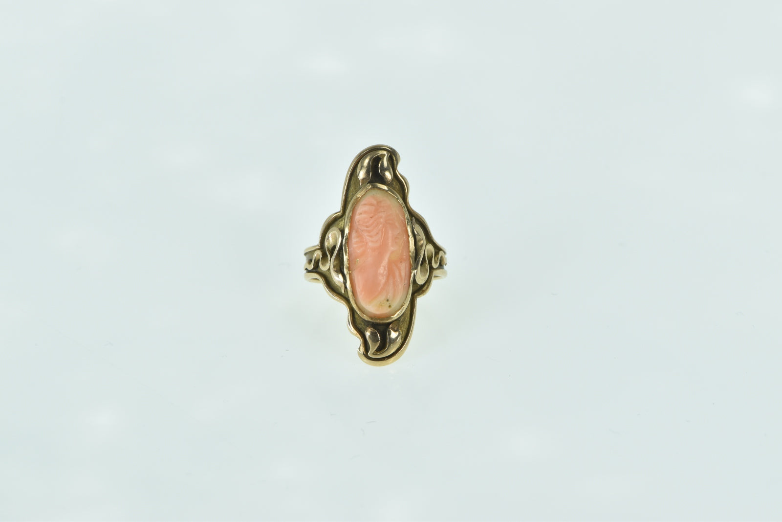 ·Item: 14K Art Nouveau Carved Coral Ornate Cameo Ring Size 4 Yellow Gold
