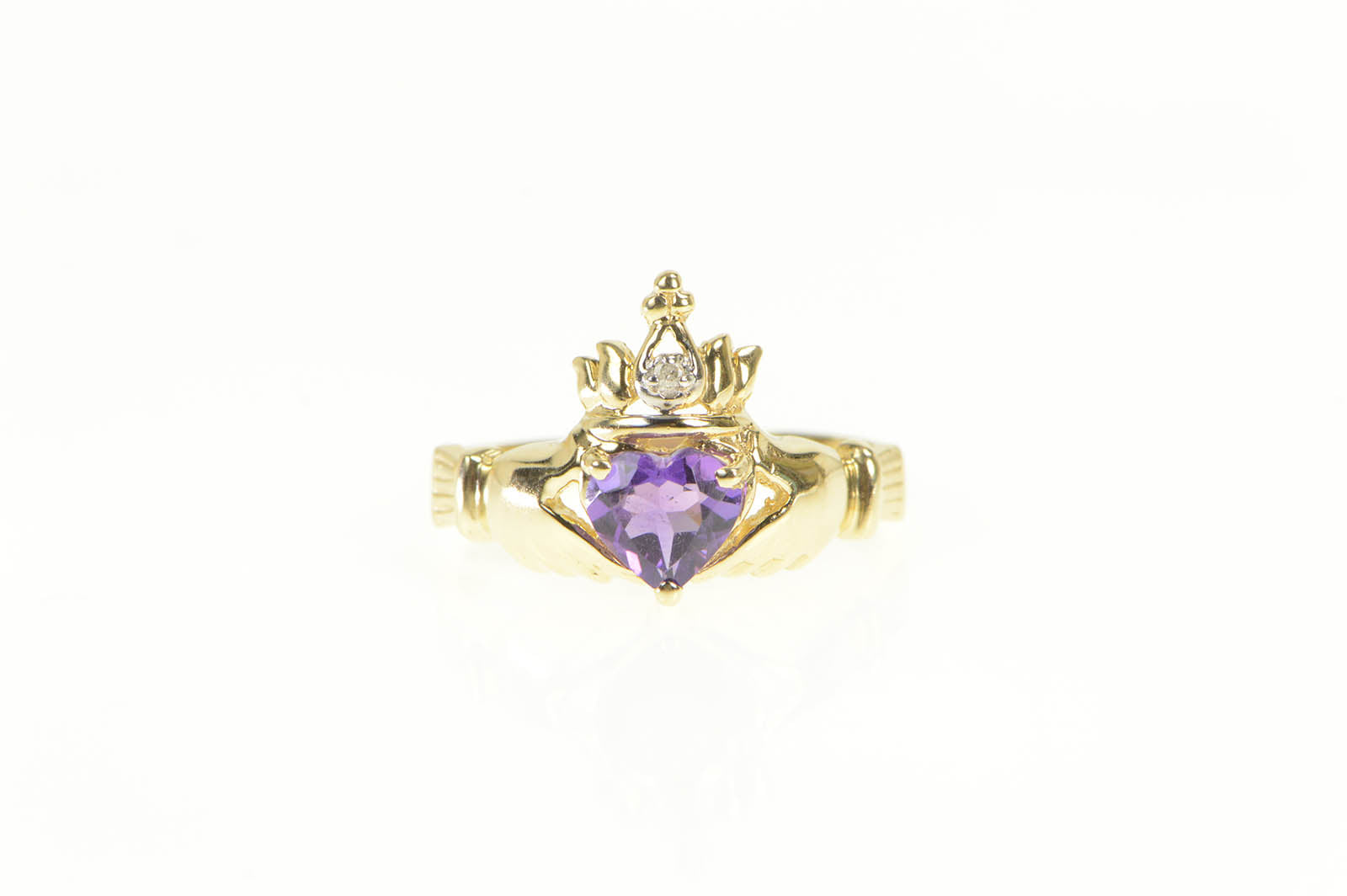 ·Item: 14K Claddagh Heart Amethyst Diamond Loyalty Ring Size 7 Yellow Gold