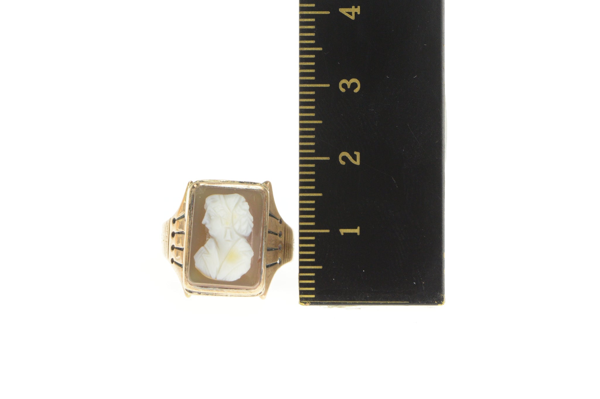 ·Item: 14K Ornate Carved Coral Shell Cameo Statement Ring Size 7.25 Yellow Gold