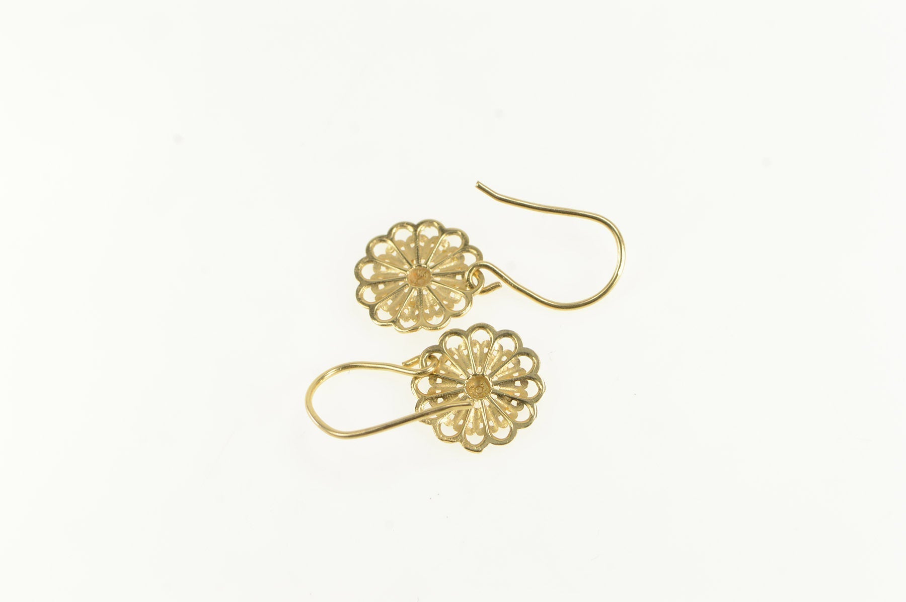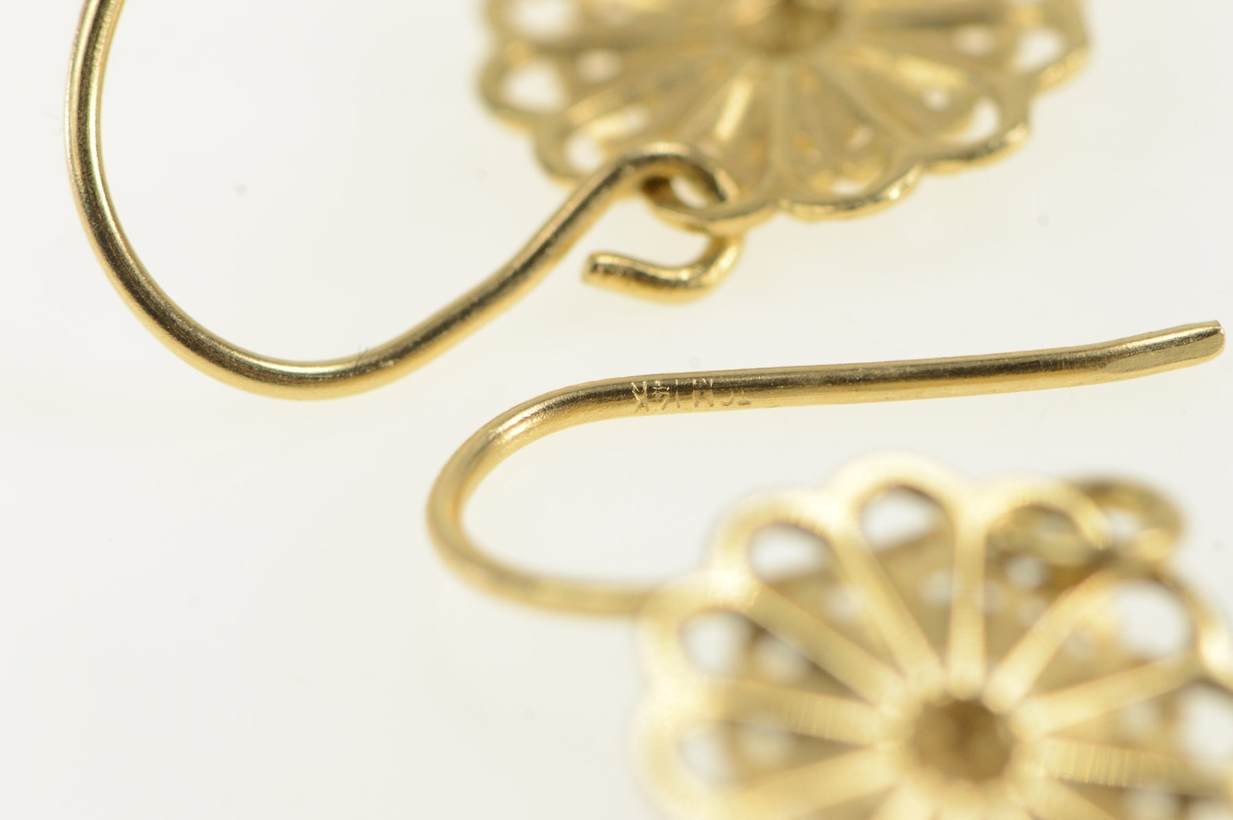 ·Item: 14K Ornate Filigree Scalloped Flower Dangle Drop Earrings Yellow Gold
