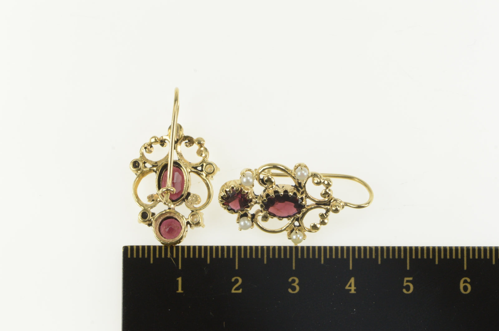 14K Ornate Garnet Seed Pearl Filigree Dangle Earrings Yellow Gold