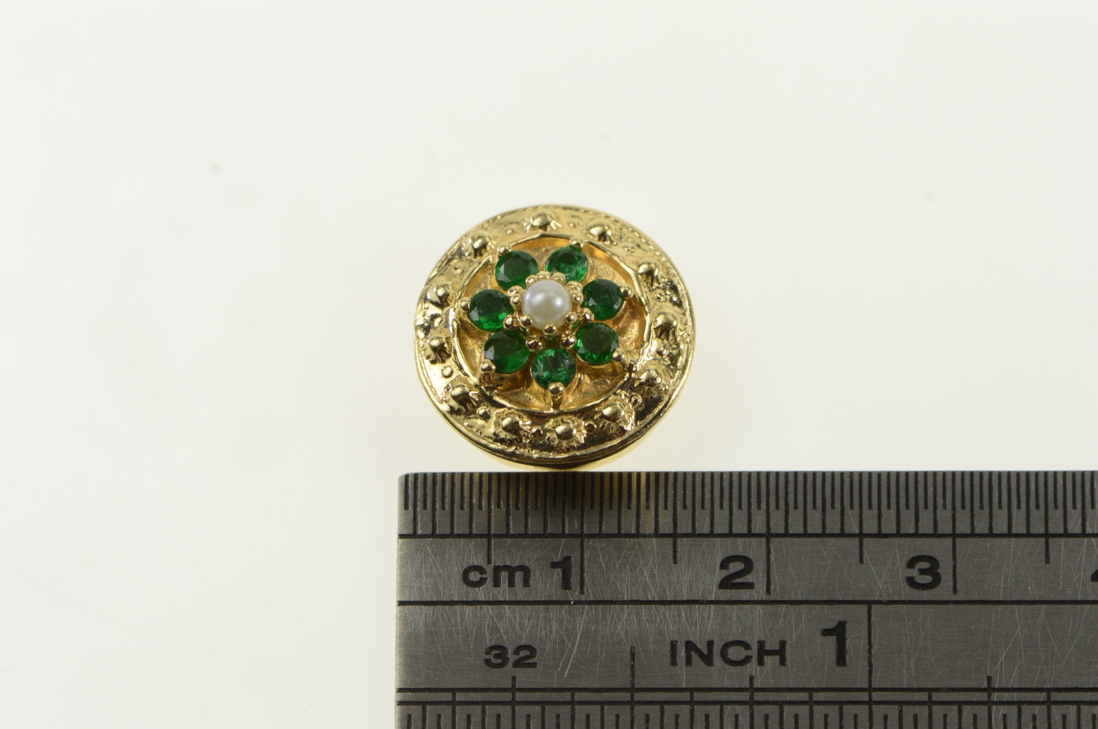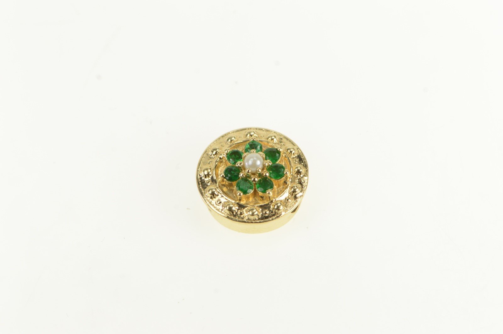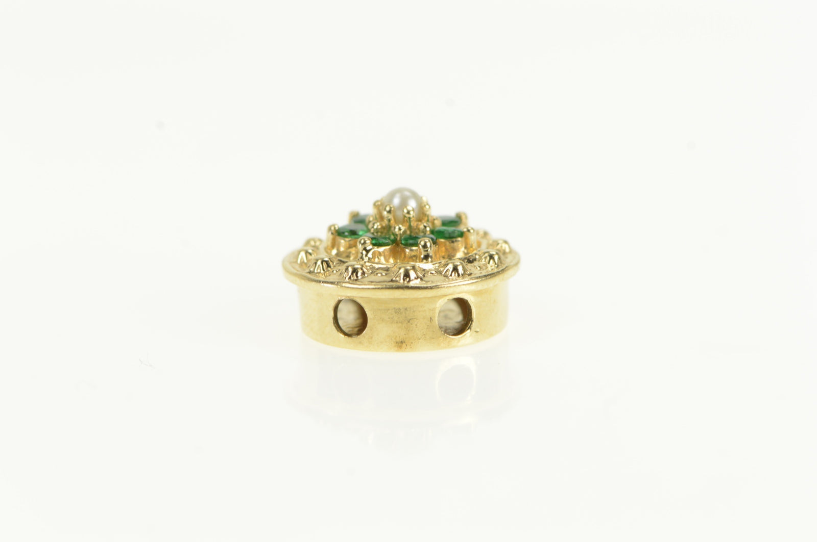 14K Ornate Pearl Sim. Emerald Round Slide Charm Bracelet Yellow Gold