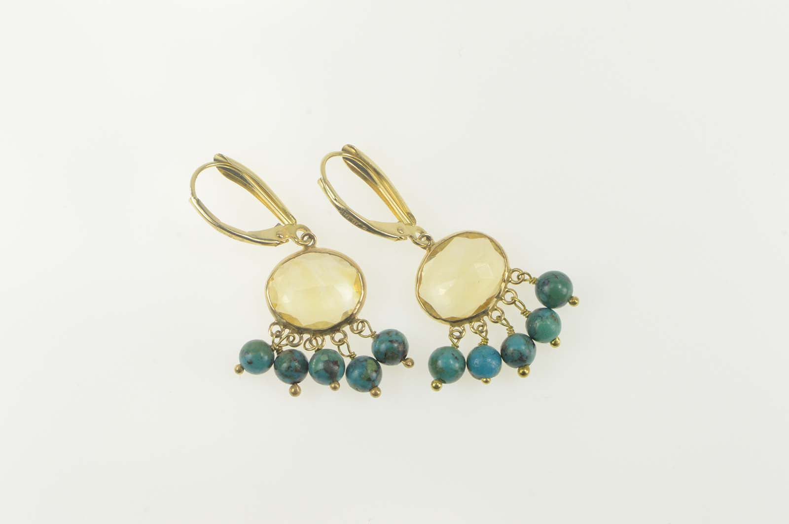 ·Item: 14K Oval Citrine Turquoise Fringe Dangle Statement Earrings Yellow Gold