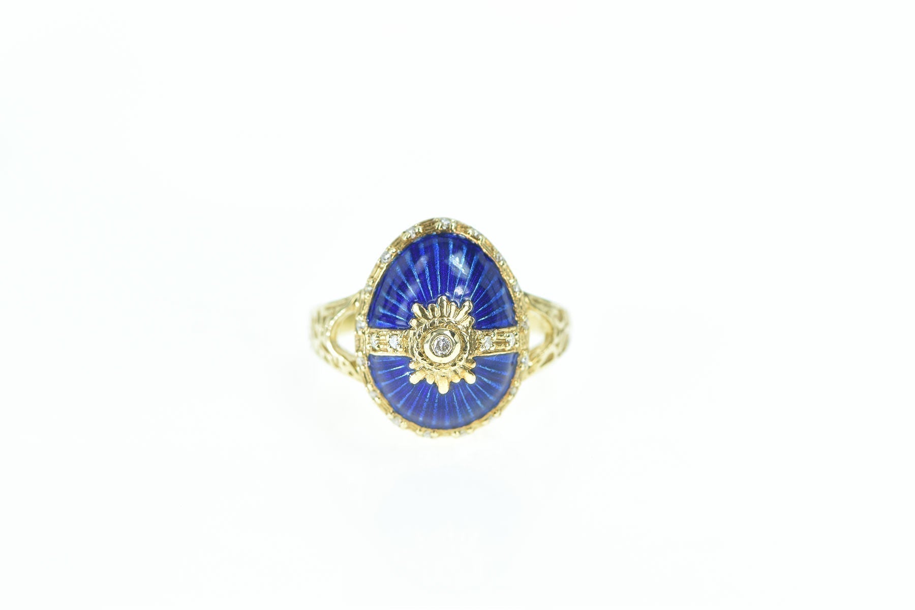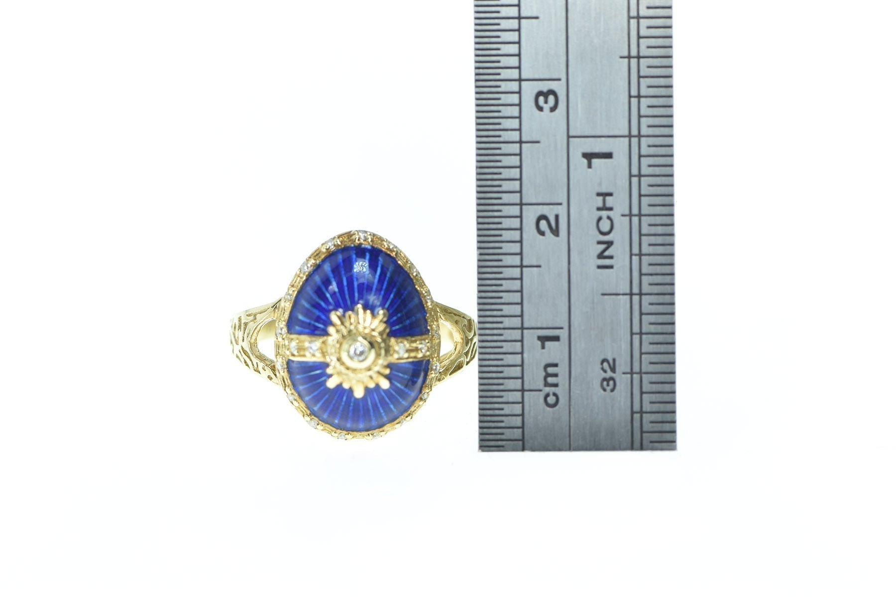 ·Item: 14K Oval Diamond Blue Enamel Egg Ring Size 7 Yellow Gold