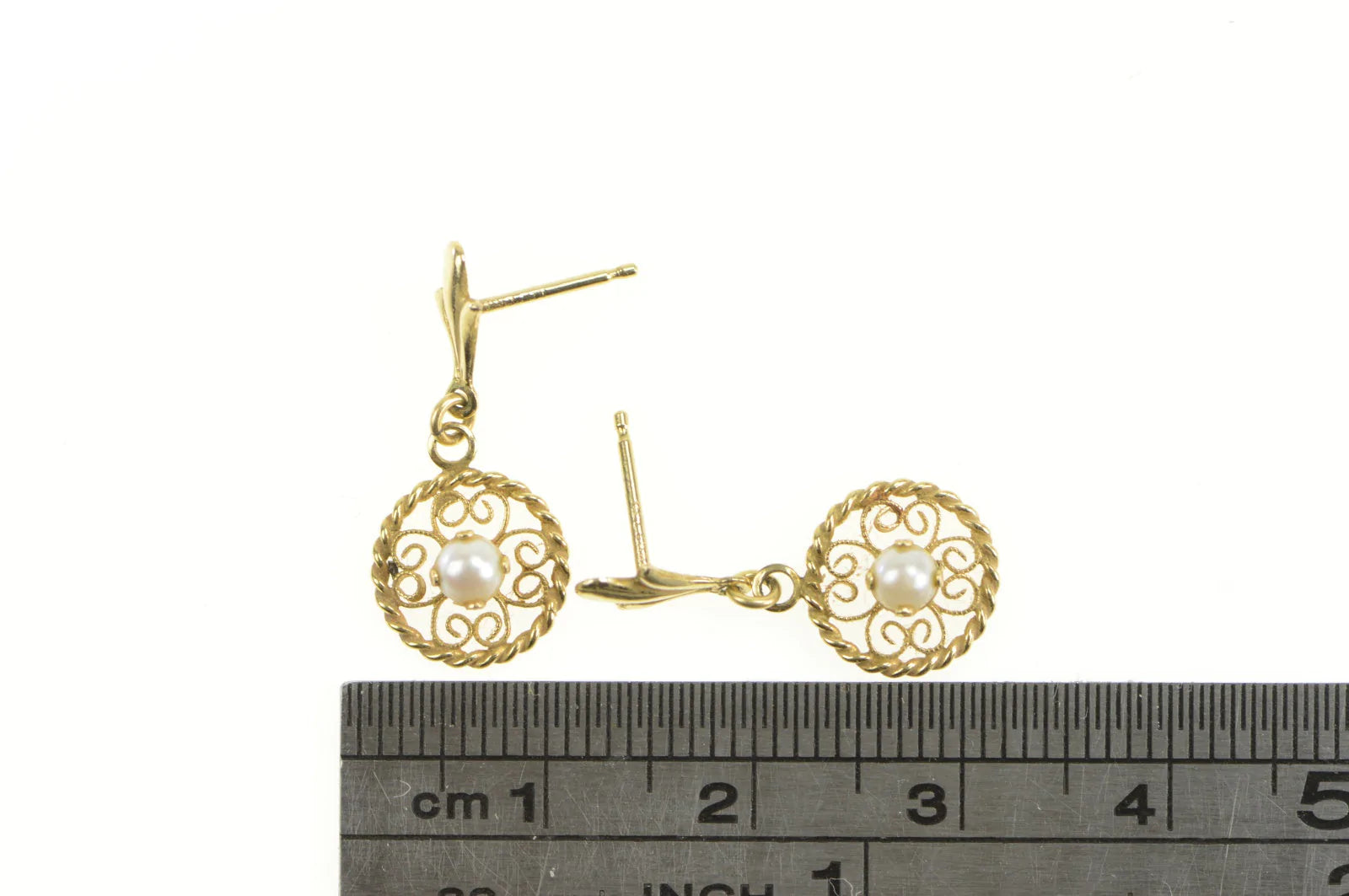 ·Item: 14K Pearl Round Filigree Dangle Vintage Retro Earrings Yellow Gold