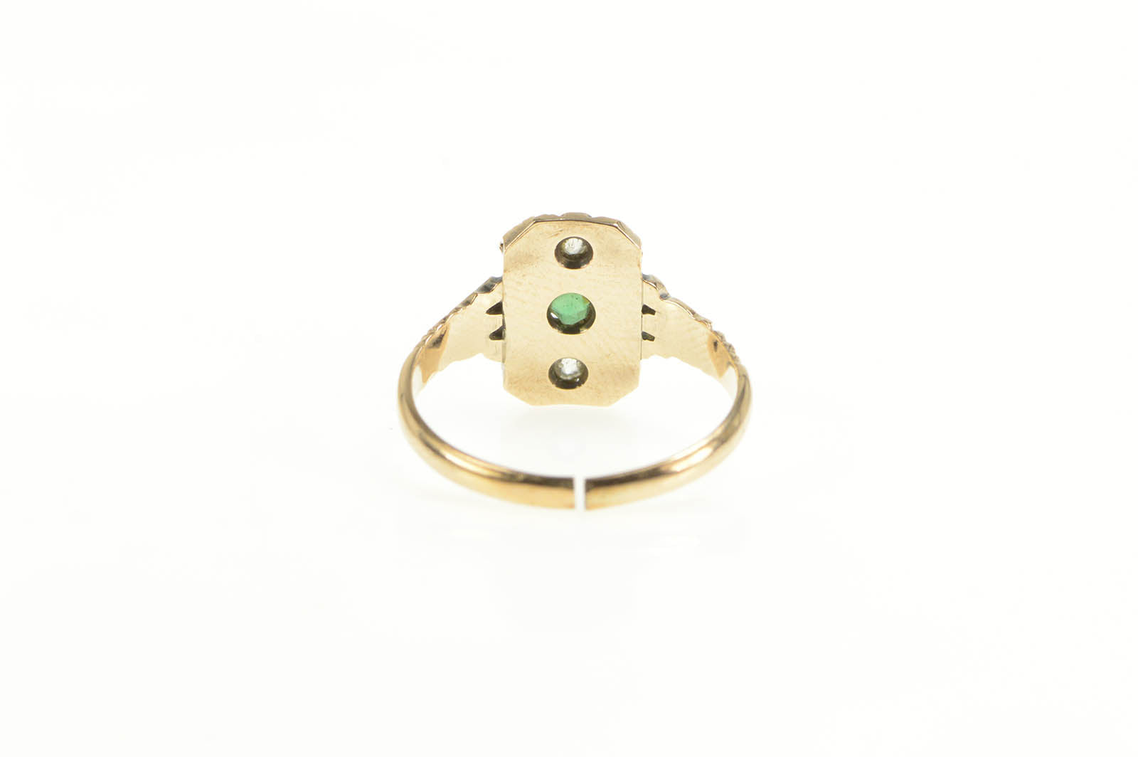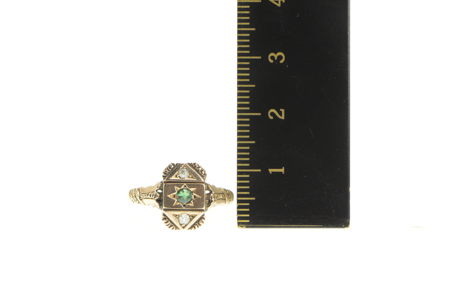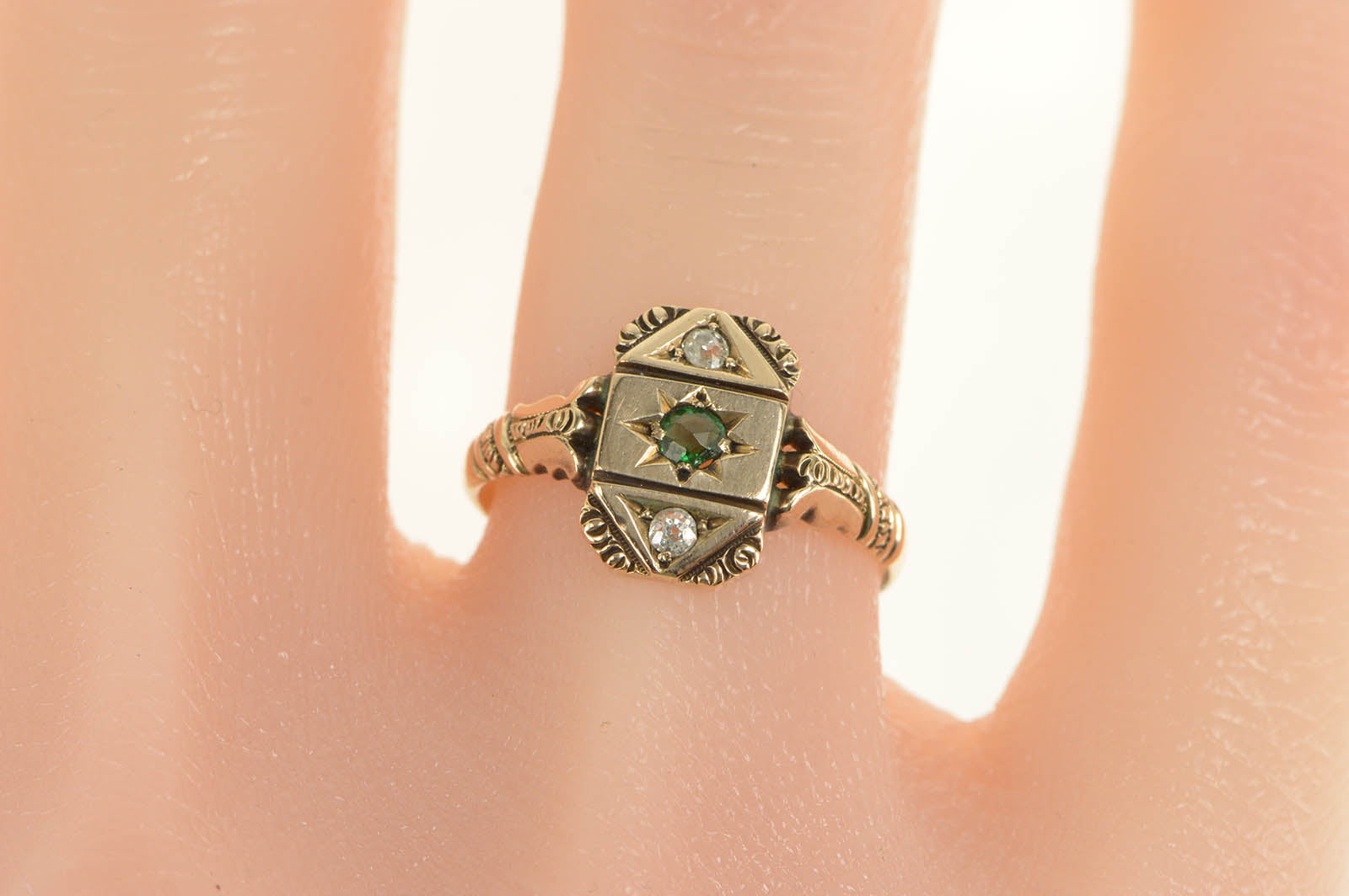 ·Item: 14K Victorian Syn. Emerald OEC Diamond Ornate Ring Size 7.5 Yellow Gold
