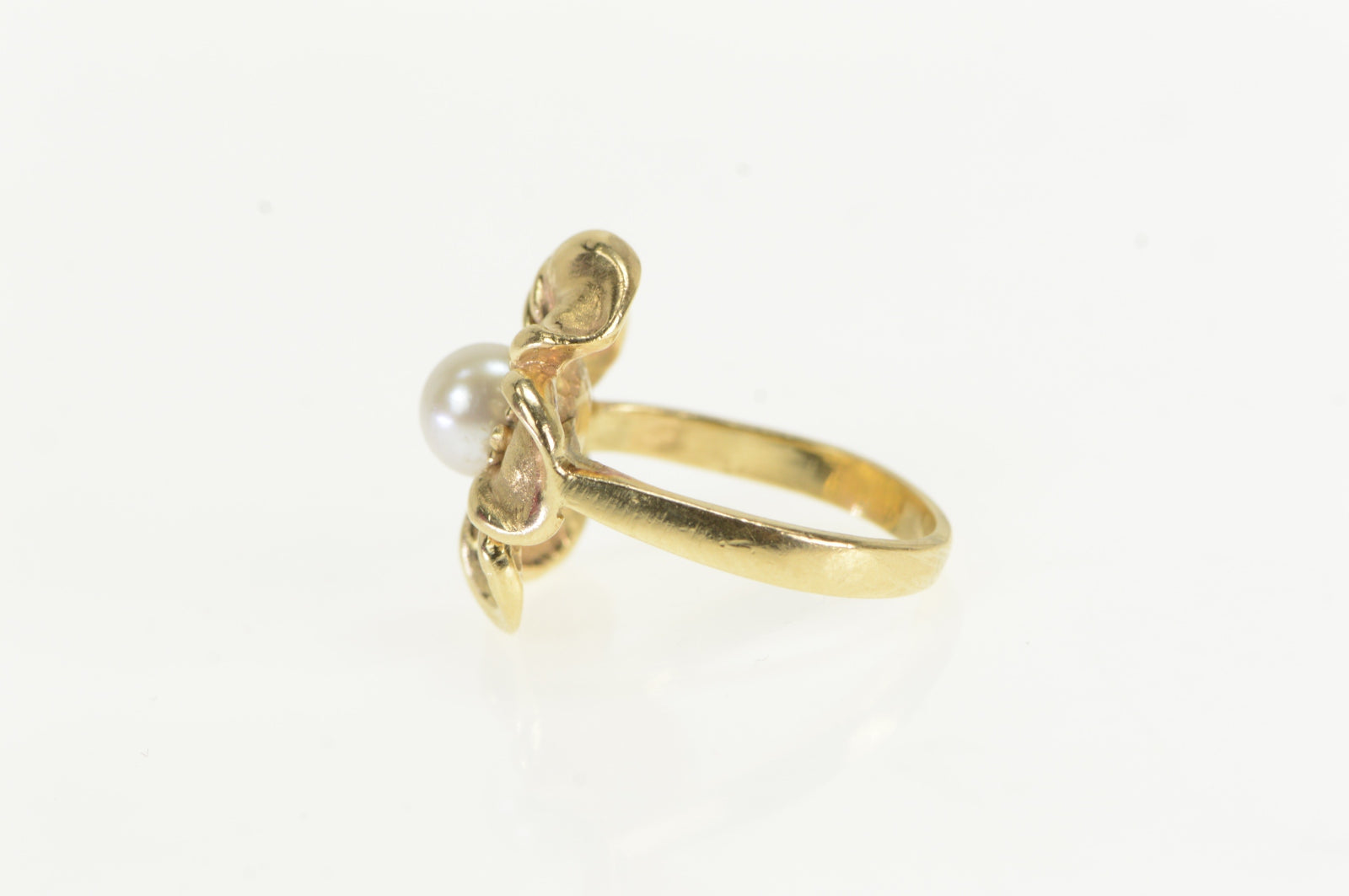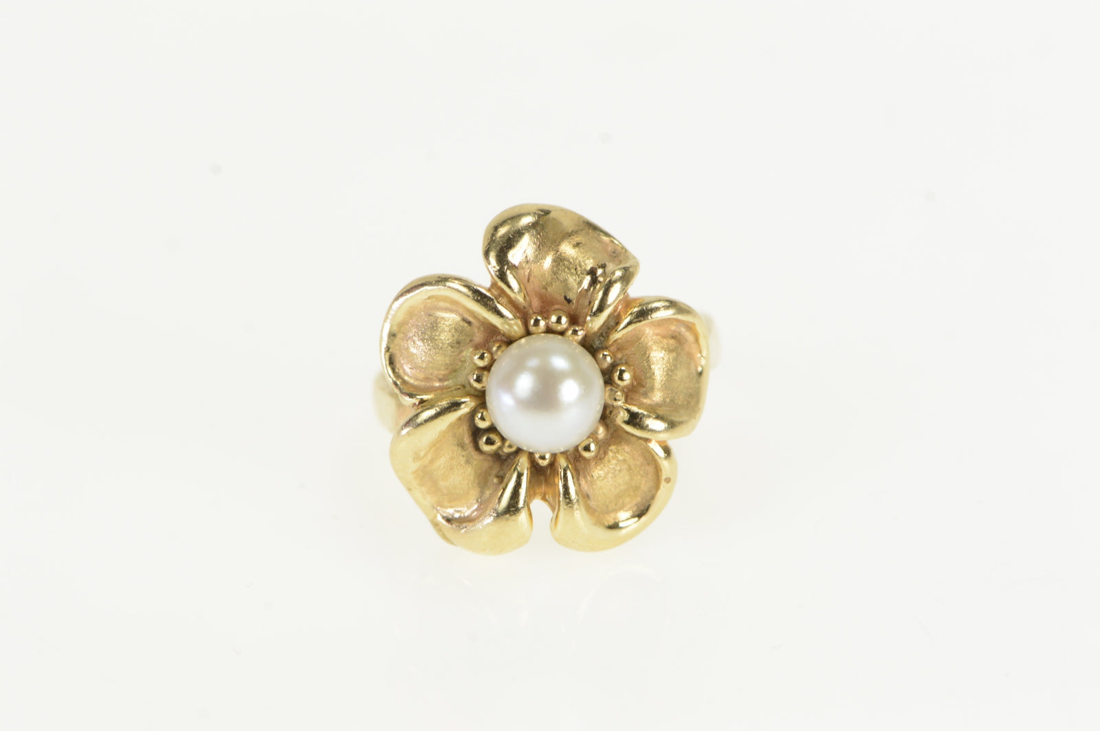 ·Item: 14K Vintage Pearl Hibiscus Flower Statement Ring Size 5.5 Yellow Gold