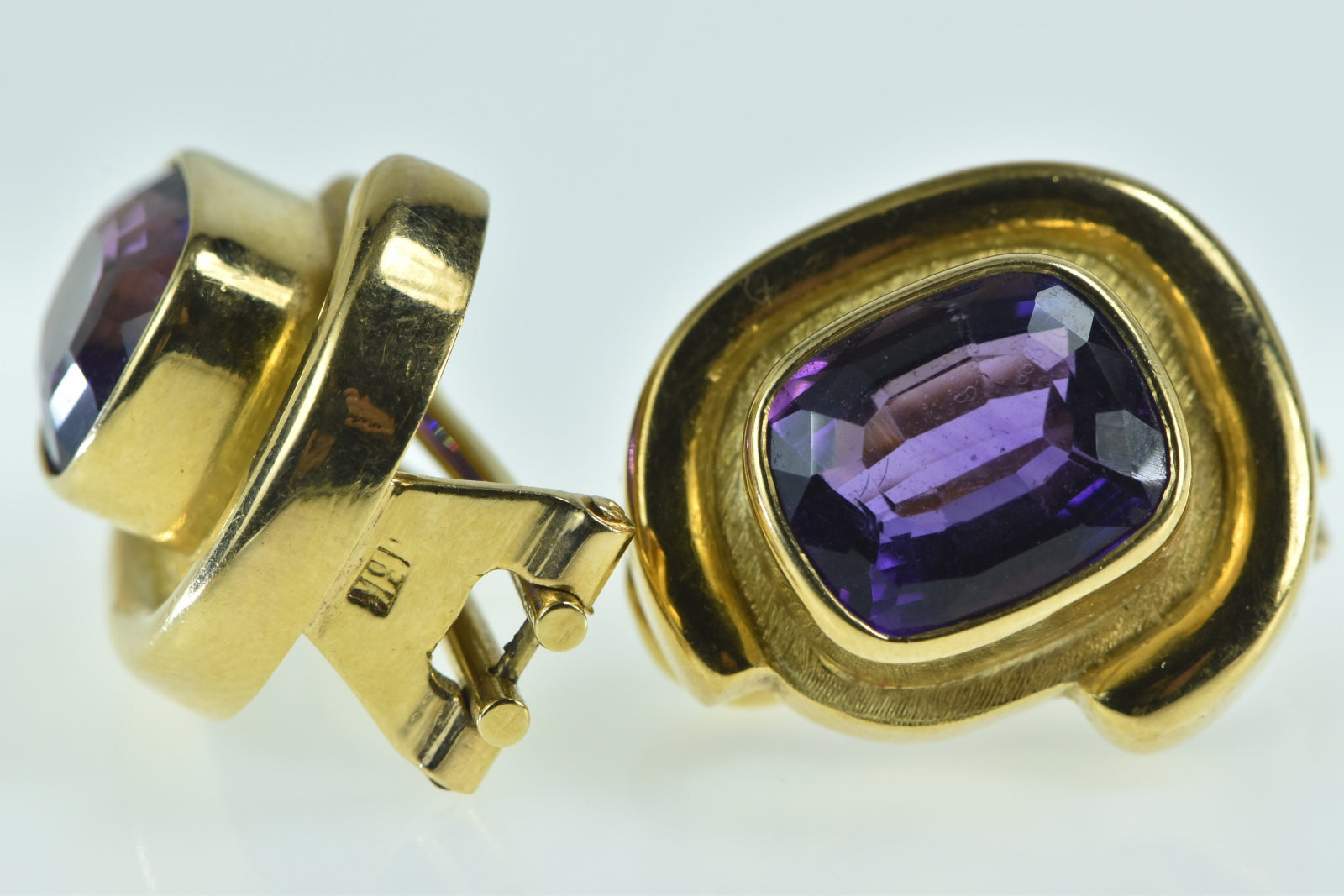 ·Item: 18K Emerald Cut Amethyst Ornate French Clip Earrings Yellow Gold