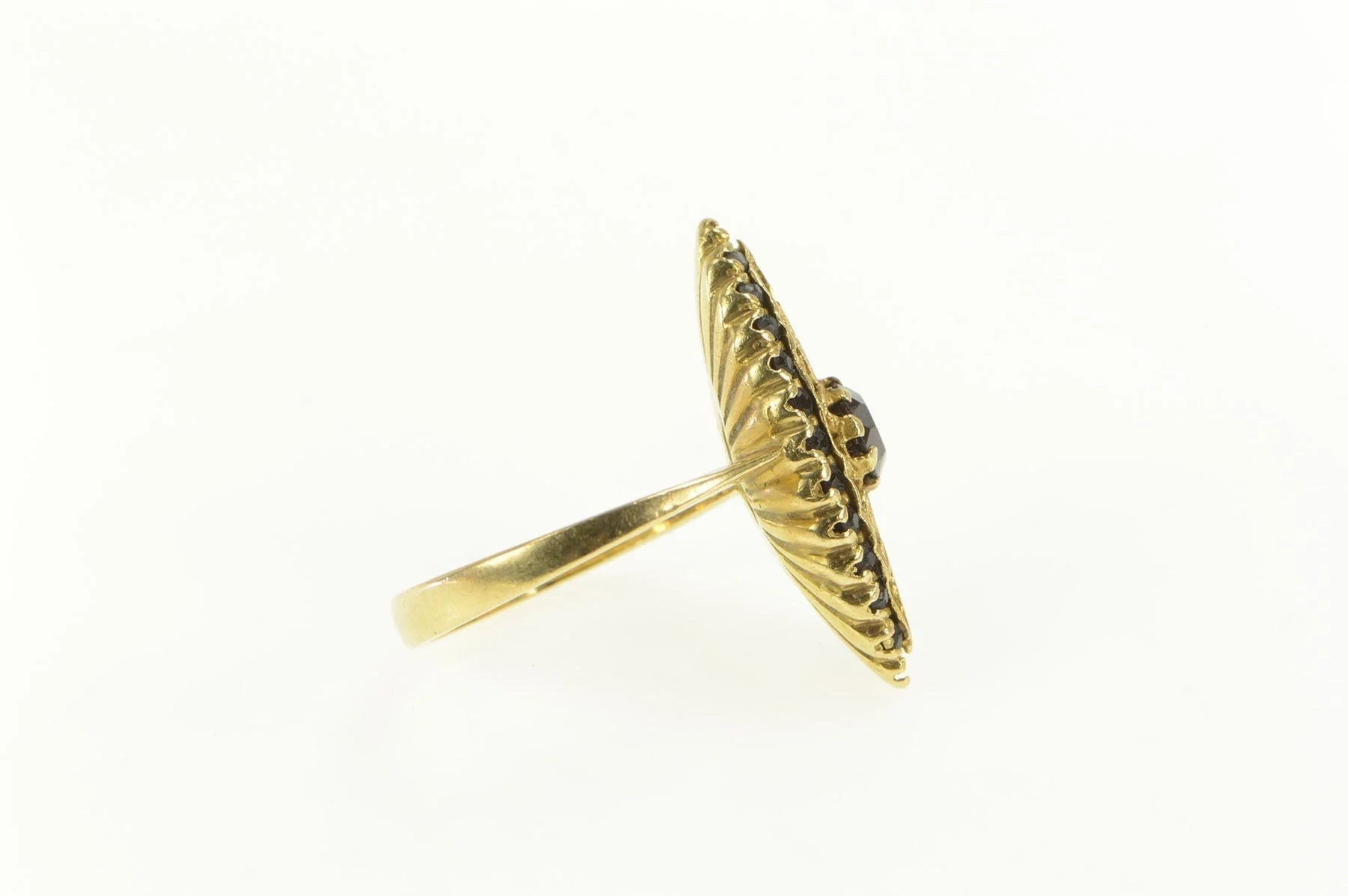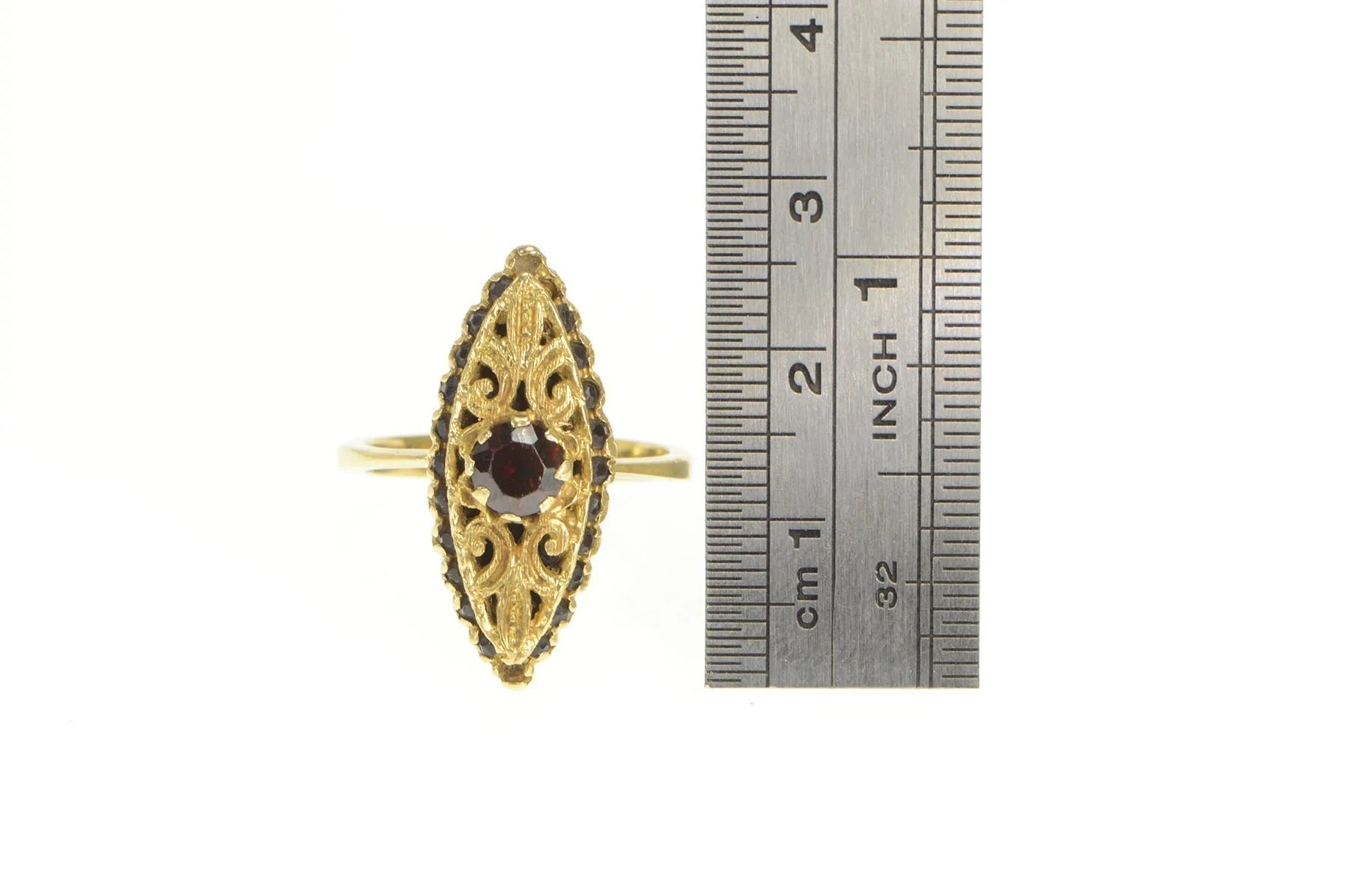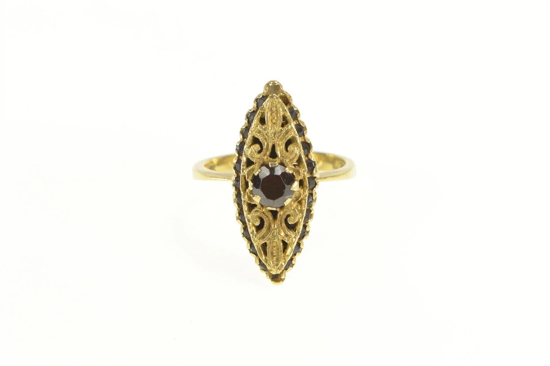 ·Item: 18K Marquise Garnet Onyx Filigree Cocktail Ring Size 7.75 Yellow Gold