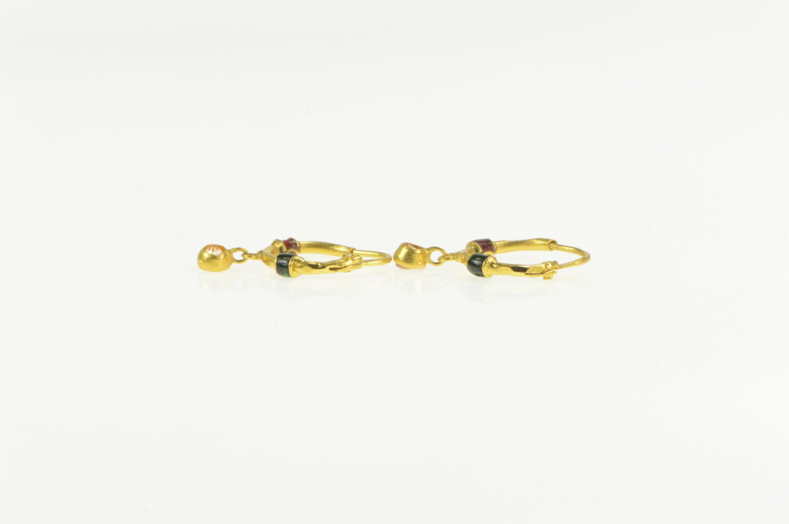 ·Item: 22K Red Green Enamel Quartz Dangle Charm Hoop Earrings Yellow Gold