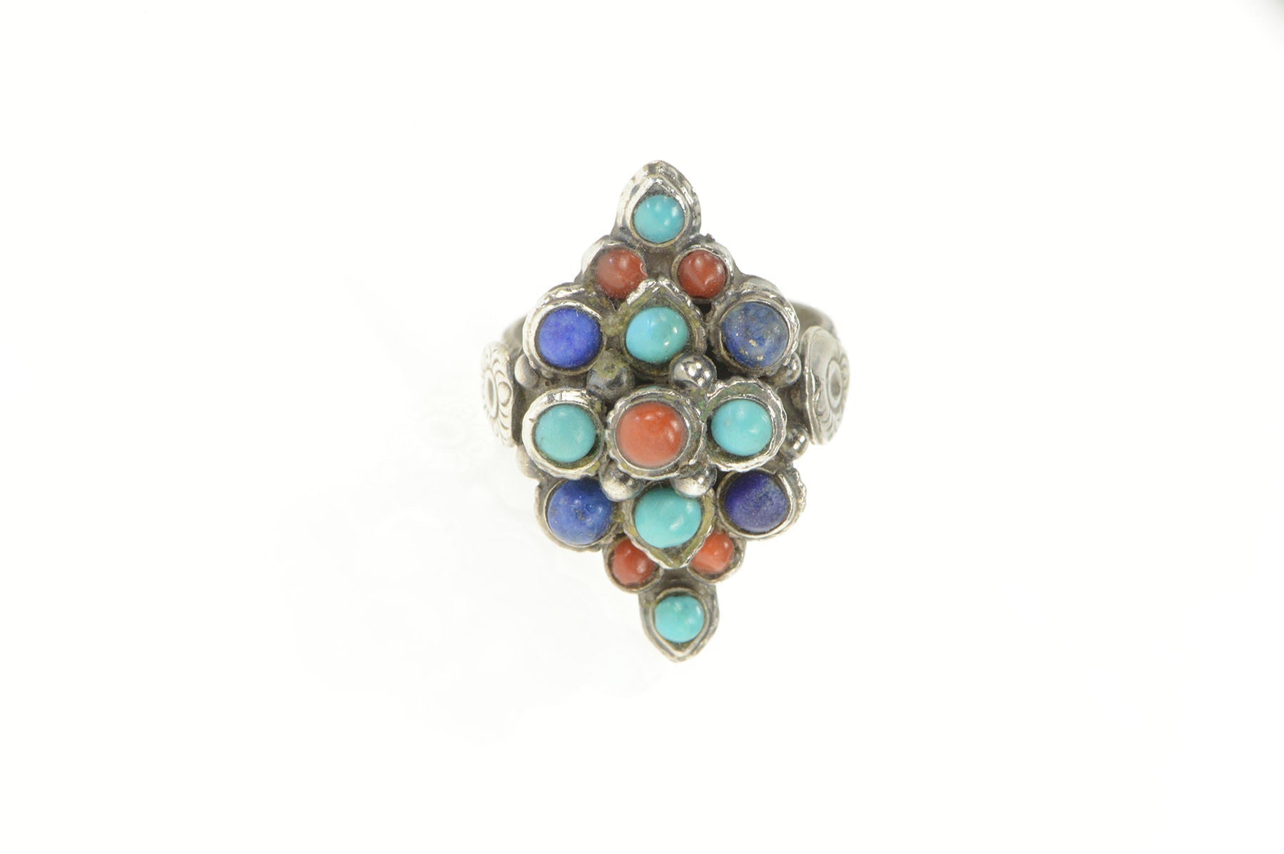 ·Item: Sterling Silver Turquoise Coral Lapis Lazuli Round Elaborate Ring Size 7.25